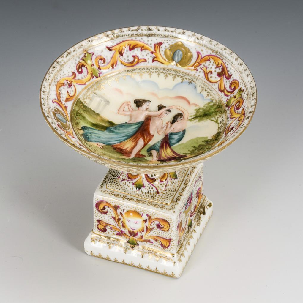 Fußschale auf quadratischem Sockel. Mit leuchtend farbig staffiertem Figuren- und Floralrelief.
