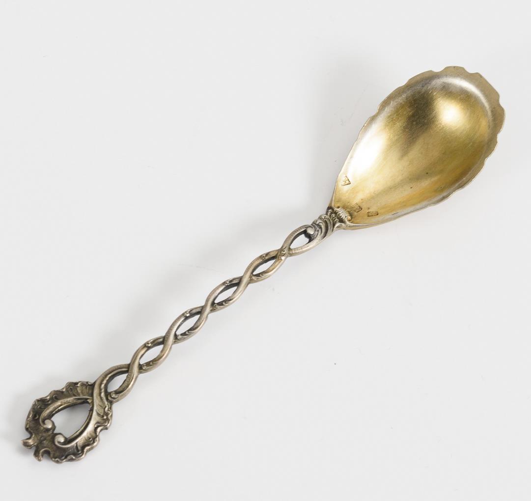 Zierliche Löffelchen mit vergoldeter Laffe, gedrehtem Griff und Rocaillenzier. Leichte Altersspuren.
