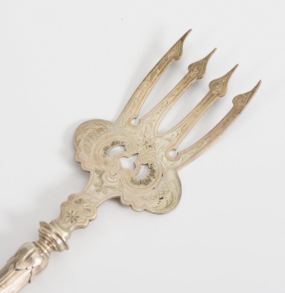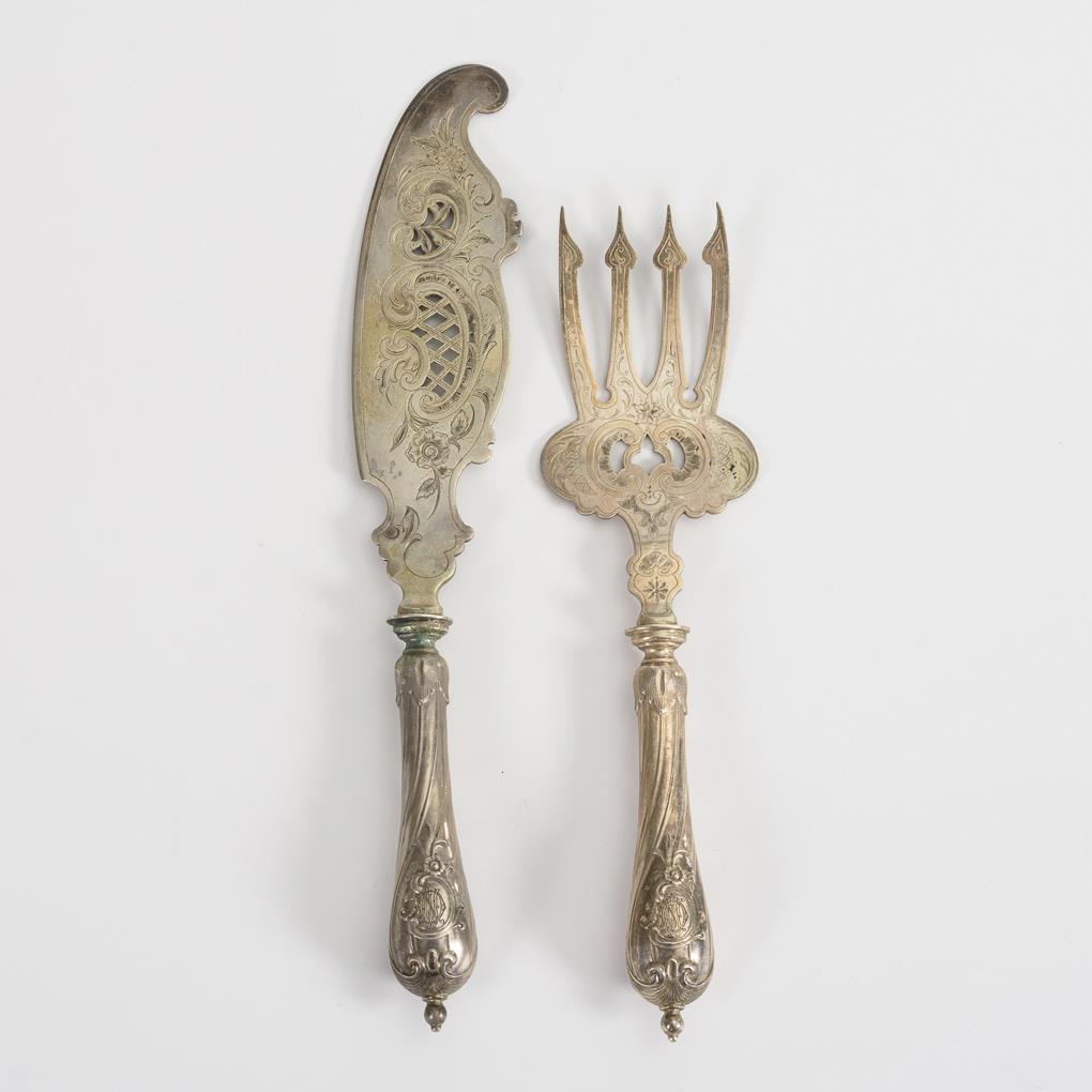 Reich graviert und durchbrochen gearbeitet, mit Monogrammgravur "MIO": Messer und vierzinkige Gabel. Leichte Alterspuren.