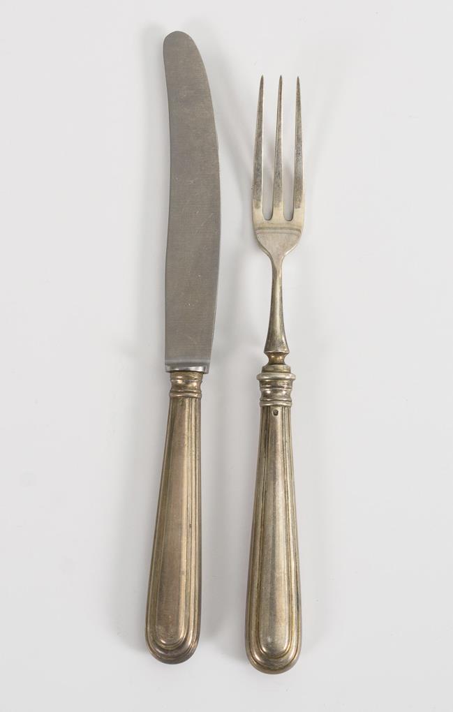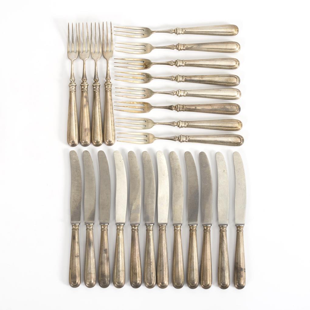 24-teiliges Besteck: 12 Obstgabeln und 12 -messer mit gefüllten Griffen. Leichte Gebrauchsspuren.
