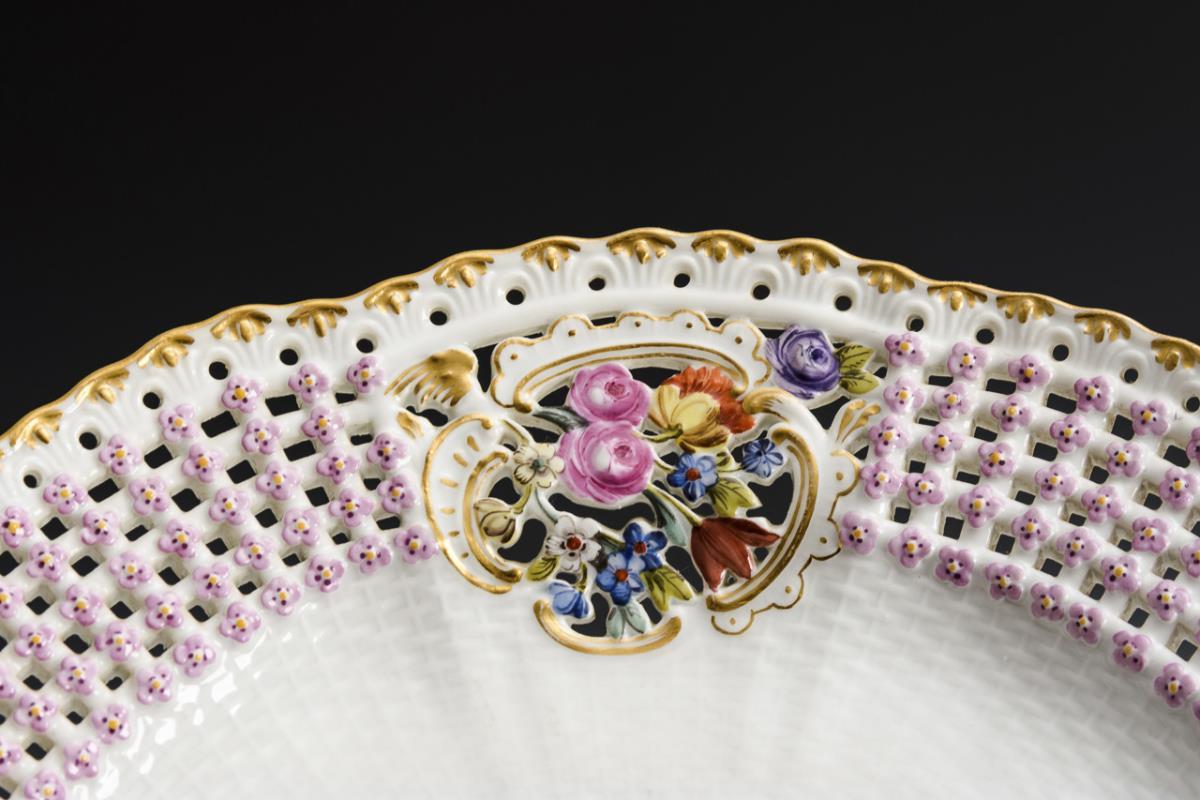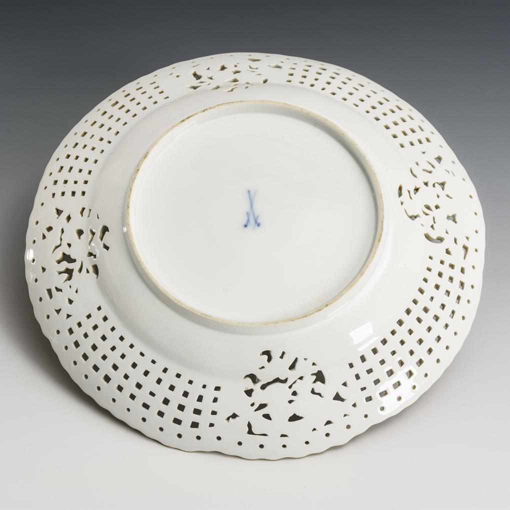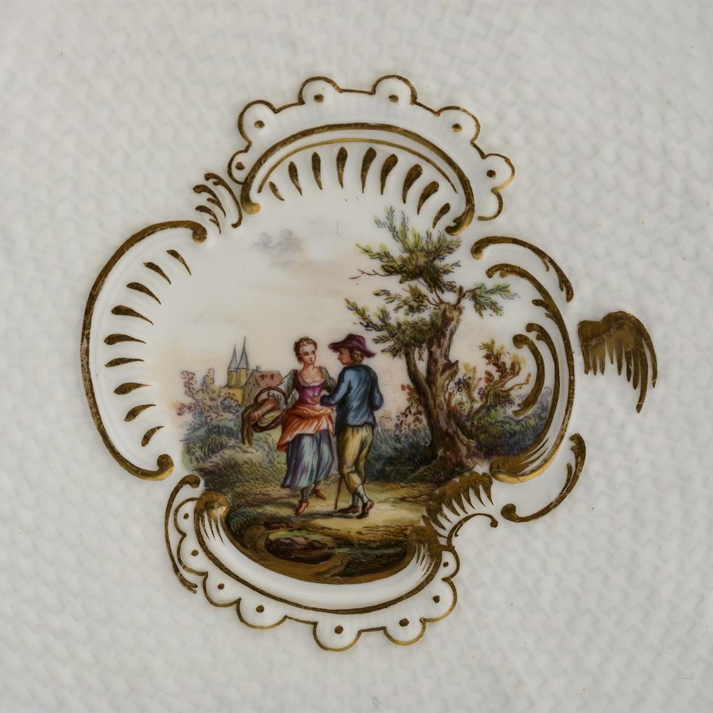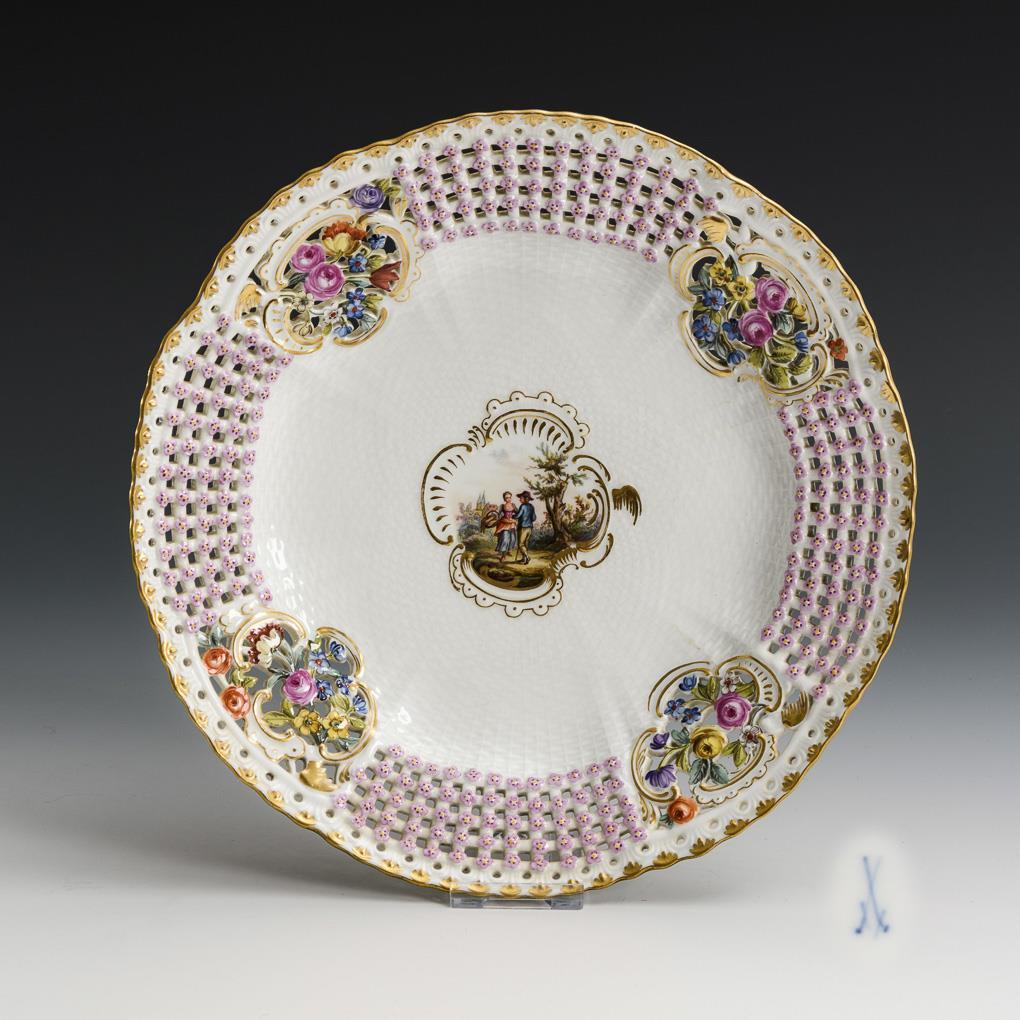 Teller mit Gitter- und Floraldurchbruch sowie Blütenrelief auf der Fahne. Im Spiegel eine kleine Vierpasskartusche mit der Darstellung eines Bauernpaares in einer Landschaft.