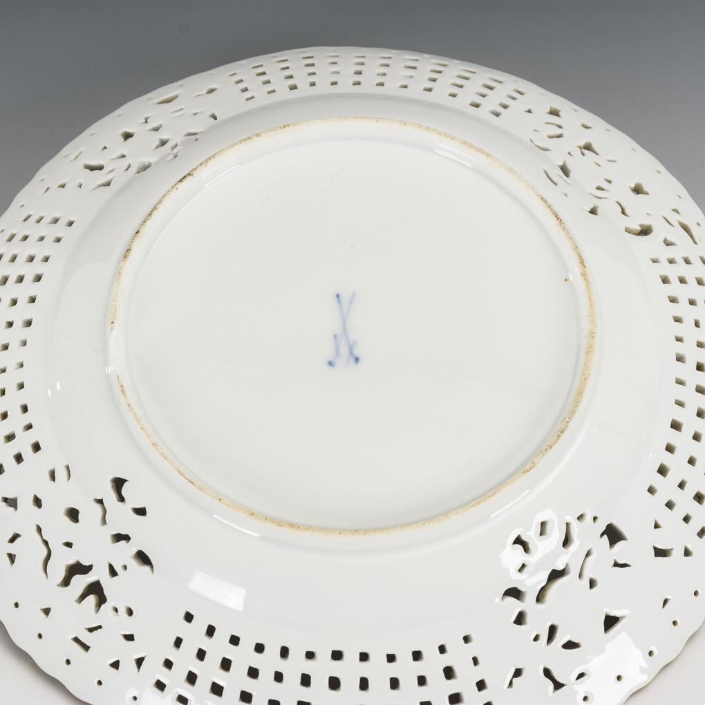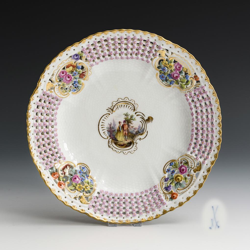 Teller mit Gitter- und Floraldurchbruch sowie Blütenrelief auf der Fahne. Im Spiegel eine kleine Vierpasskartusche mit der Darstellung eines galanten Paares in einer Landschaft. Ausbruch am Standring.