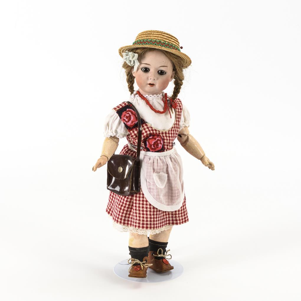 Kurbelkopf, braune Schlafaugen, blonde Perücke mit Zöpfen. 13-teiliger Gliederkörper. Rot-kariertes Kleid, weiße Bluse, Voileschürze, alte Schuhe und Strümpfe. Dazu Strohhut und braune Umhängetasche. Perücke festgeklebt: Kopf nicht durchleuchtet, 1 Hand farblich abweichend.