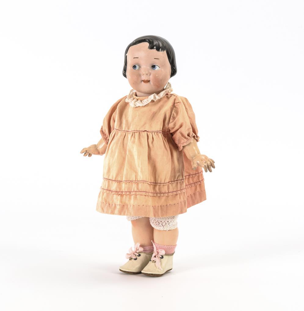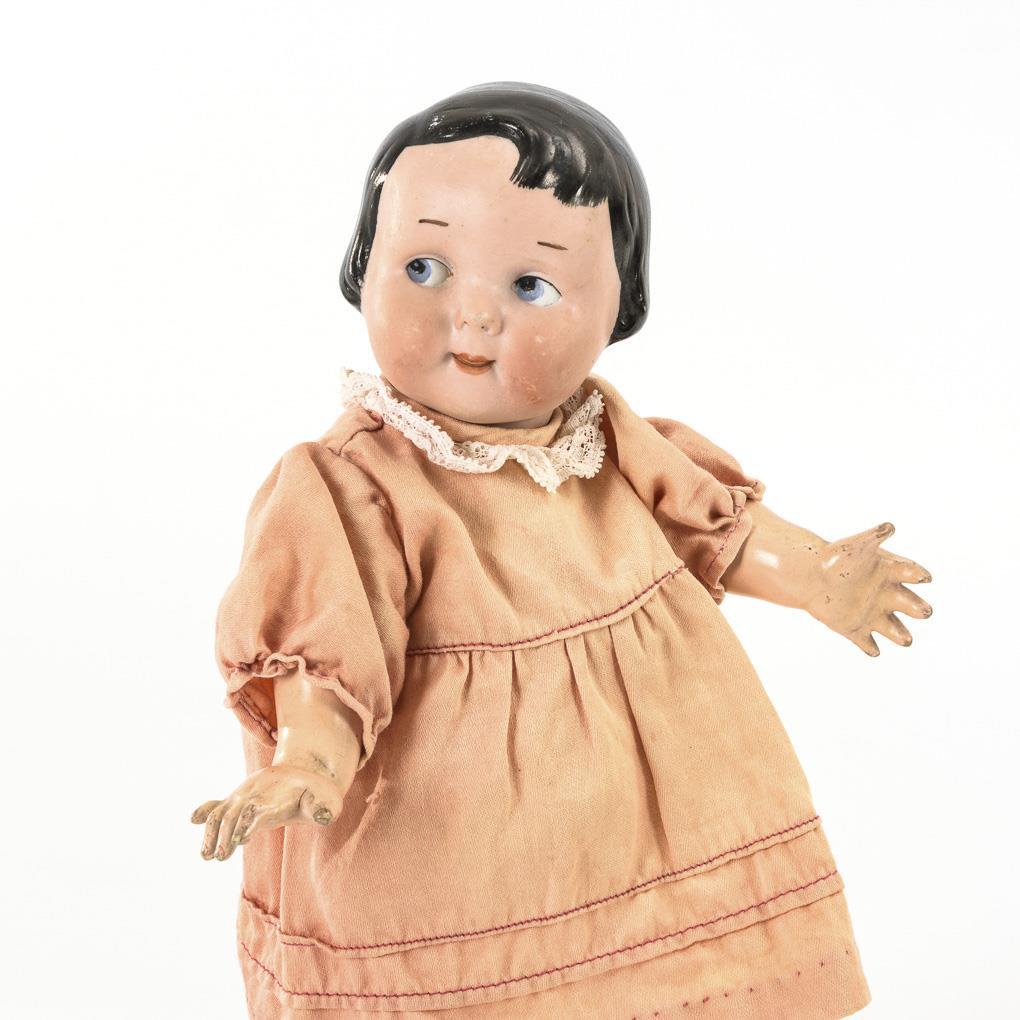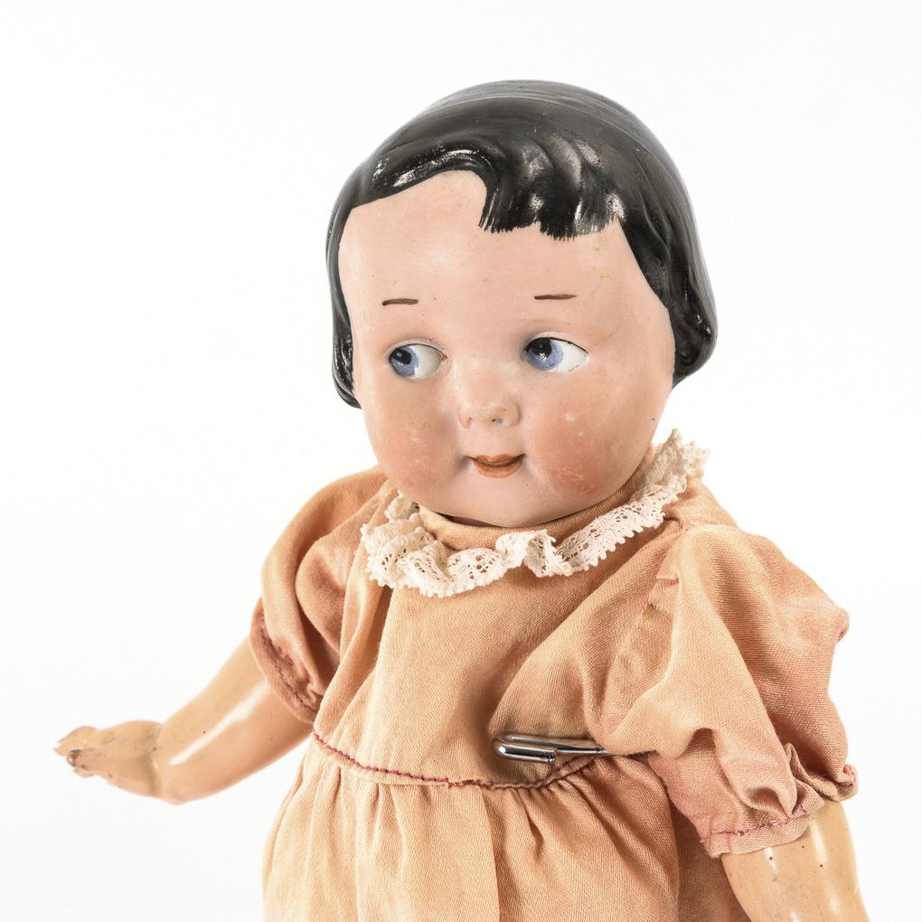 Kurbelkopf, gemalte blaue Schielaugen, modellierte schwarze Pagenfrisur. 5-teiliger Stehpuppenkörper. Rosa Kleid, weiße Schuhe. Ohne sichtbare Defekte.