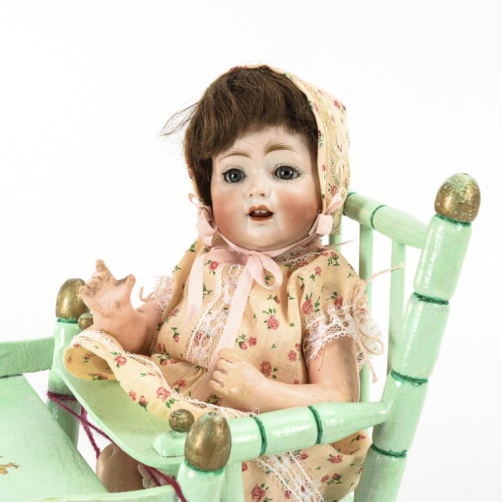 Kurbelkopf, blaue Schlafaugen, braune Mohairperücke. 5-teiliger Sitzbabykörper. Geblümtes Kleidchen, passende Haube. Mintgrün nachlackiertes, klappbares Stühlchen mit Tisch. Kopf nicht durchleuchtet: ohne sichtbare Defekte. Linke Hand mit Reparaturen, 1 Zeh bestoßen.