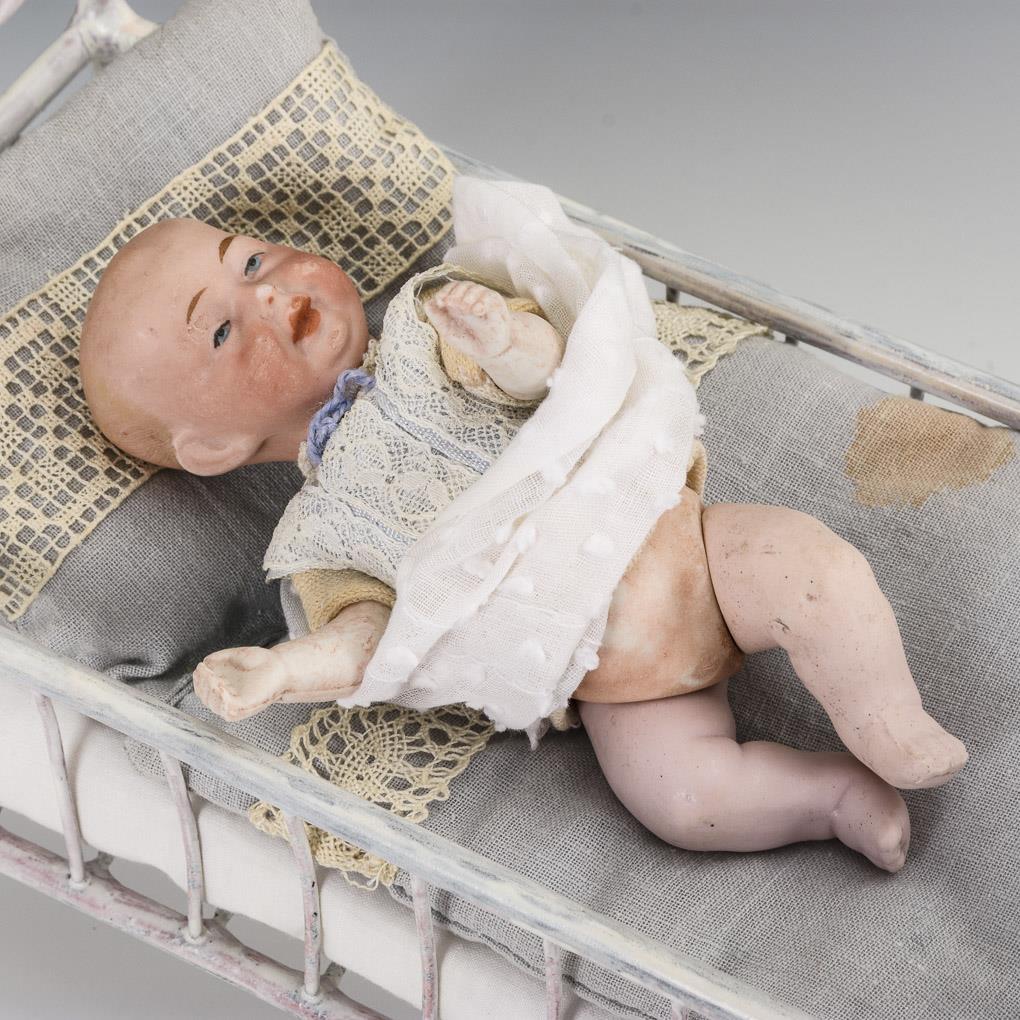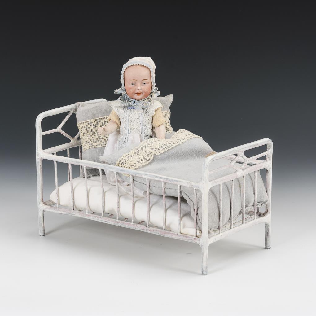 Babypüppchen mit Kurbelkopf, in Art der "Kaiserbabys". In weißem Kleidchen. Dazu weiß gestrichenes Bettchen mit Bettzeug. Glieder wohl ergänzt, Riss im Körper. Bett nachlackiert.