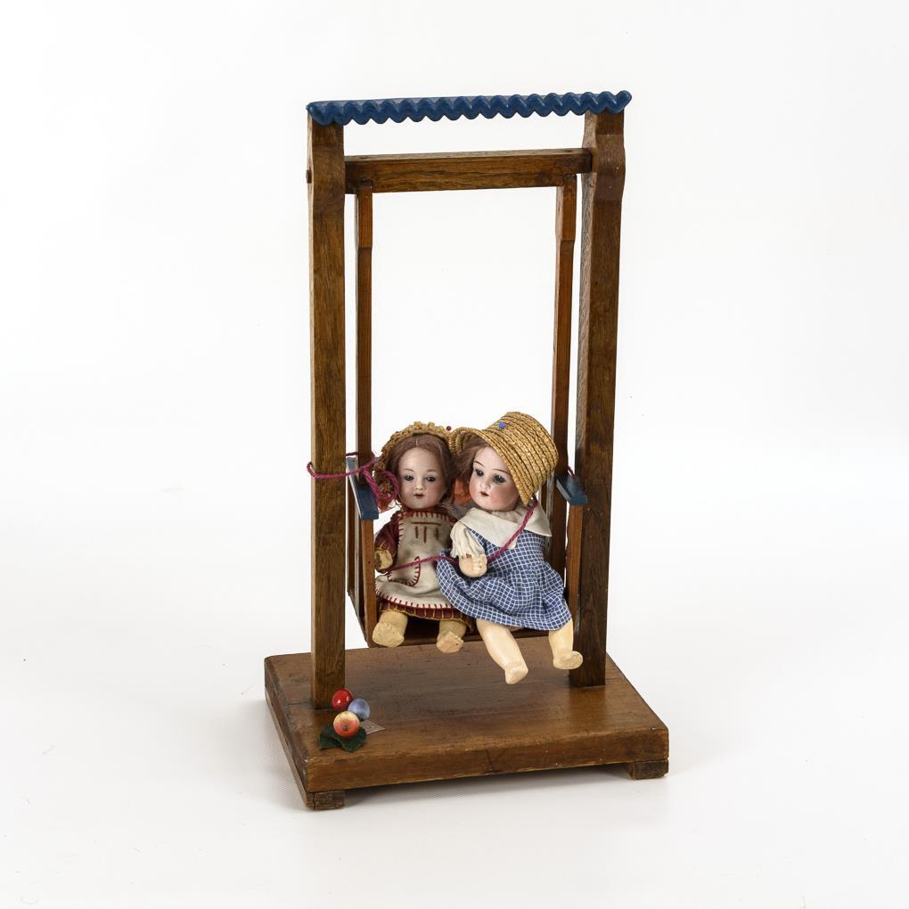 Beide Püppchen mit Kurbelkopf, blauen Schlafaugen, Mohairperücke, 5-teiligem Babykörper und originaler Kleidung. Schaukel Eigenbau aus Eiche. Altersspuren, Körper teils übermalt.