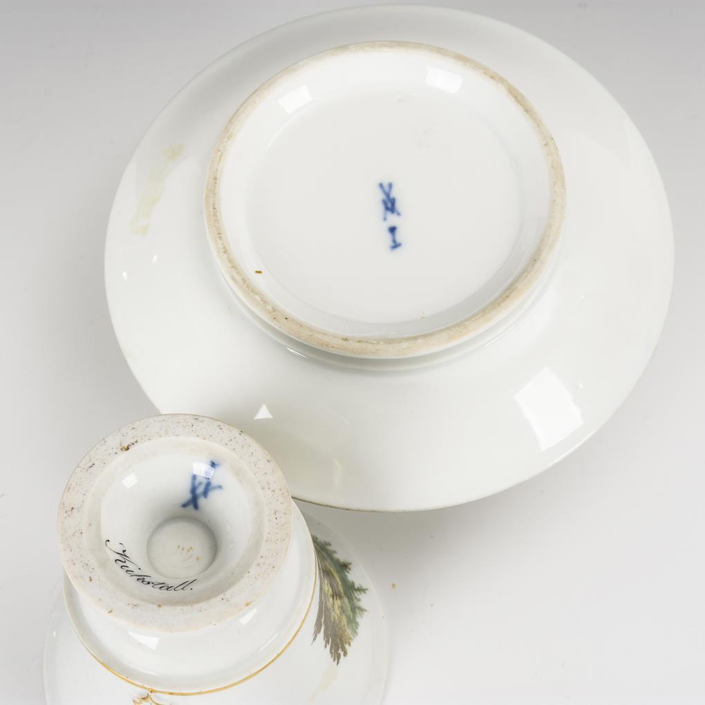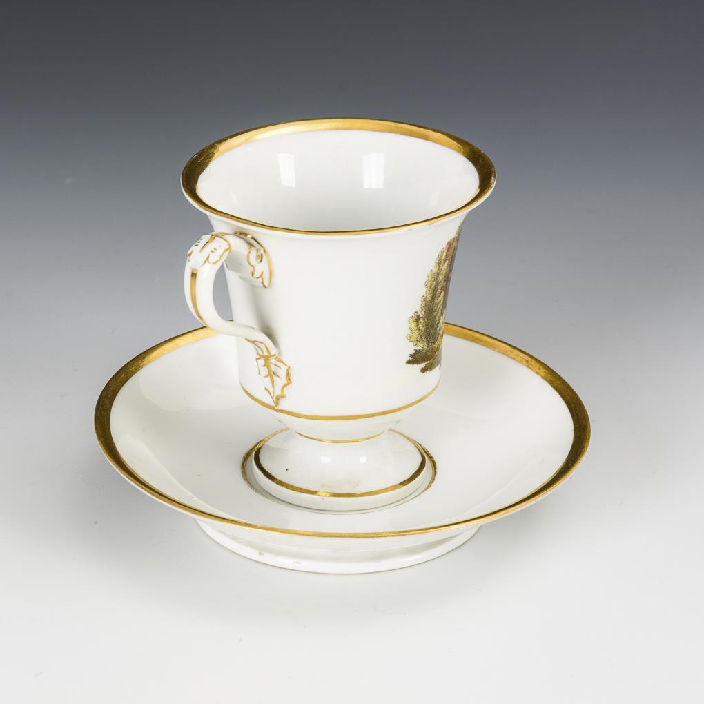 Polychrome Malerei über Vordruck, Goldstaffage. H Tasse 9 cm, Ø originale Untertasse 13,5 cm.