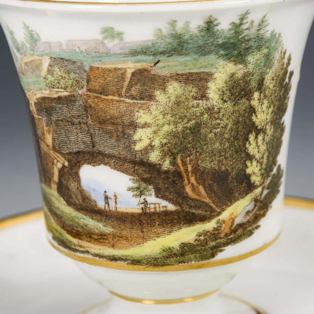 Gefußte Kratertasse mit Blatthenkel. Schauseitig die bezeichnete Ansicht des Felsentores Kuhstall in der Sächsischen Schweiz.