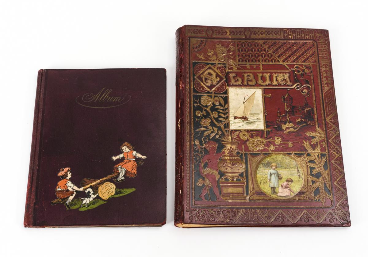 2 schöne Alben mit insgesamt 480, vorwiegend kleinen, Bildern. Darunter Kinder, Tiere und Weihnachtsmotive. Alben mit Altersspuren, Seiten teils lose.