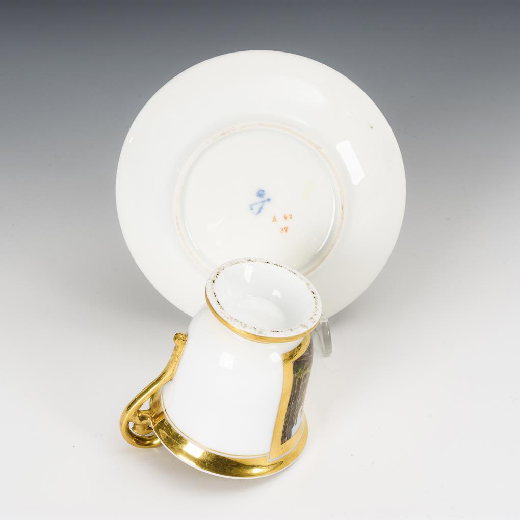 Polychrom bemalt, goldstaffiert. H Tasse 10 cm, Ø ergänzte Untertasse 14 cm.