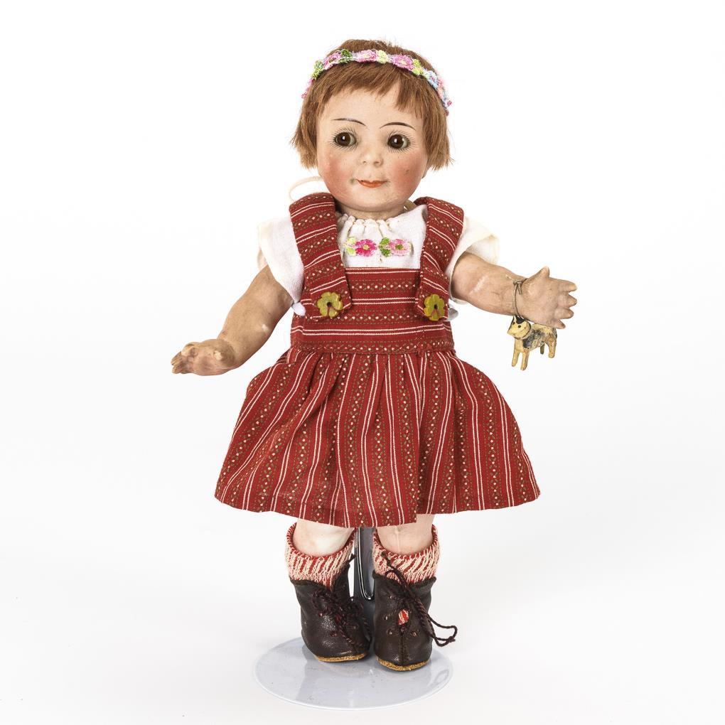 Kurbelkopf, zur Seite blickende Schlafaugen, rotblonde Mohairperücke. 5-teiliger Stehpuppenkörper. Weiße Bluse, roter Trägerrock. Am Körper (rückseitig am Halsansatz) 2 cm langer Riss, partieller Farbabrieb, unter dem rechten Fuß runder Ausbruch (wohl produktionsbedingt).
