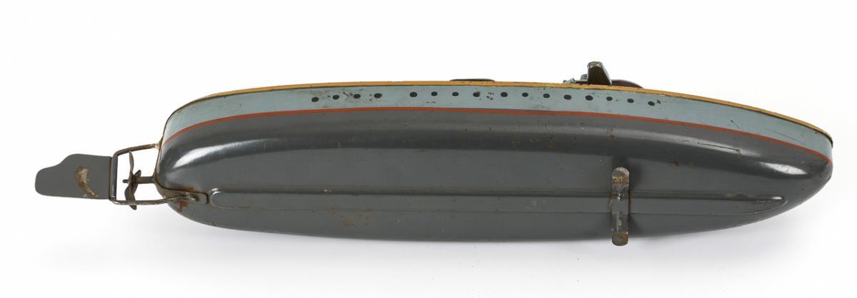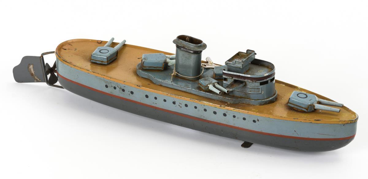 Graues Boot mit 5 drehbaren Geschossen und intaktem Werk. Dazu Schuco-Schlüssel. Altersspuren, Reling fehlt, Lötstellen und Ergänzungen.