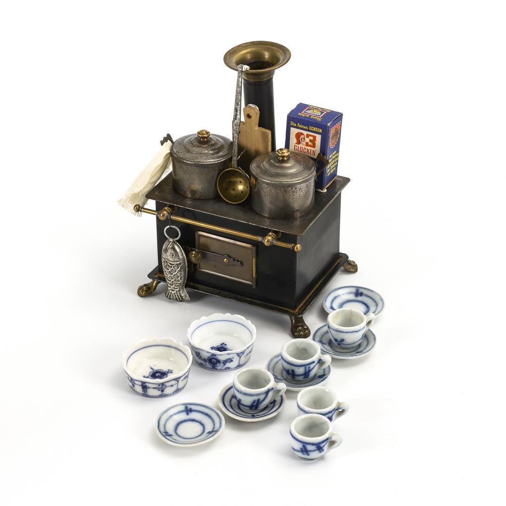 Schwarzer Herd mit Messingreling und Tatzenfüßen. Dazu 2 originale Töpfe und etwas Zubehör (Kelle, Brettchen, blau-weißes Geschirr etc.). Leichte Altersspuren.