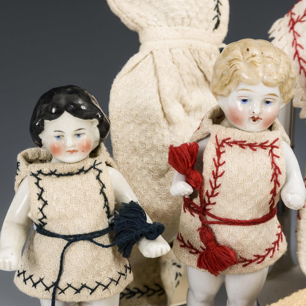 Badewanne mit Schwamm und Celluloidente. Dazu 2 größere und 6 Miniatur-Badepüppchen. Eine der beiden größeren Puppen mit modellierten Strümpfen und Schuhen (selten!).