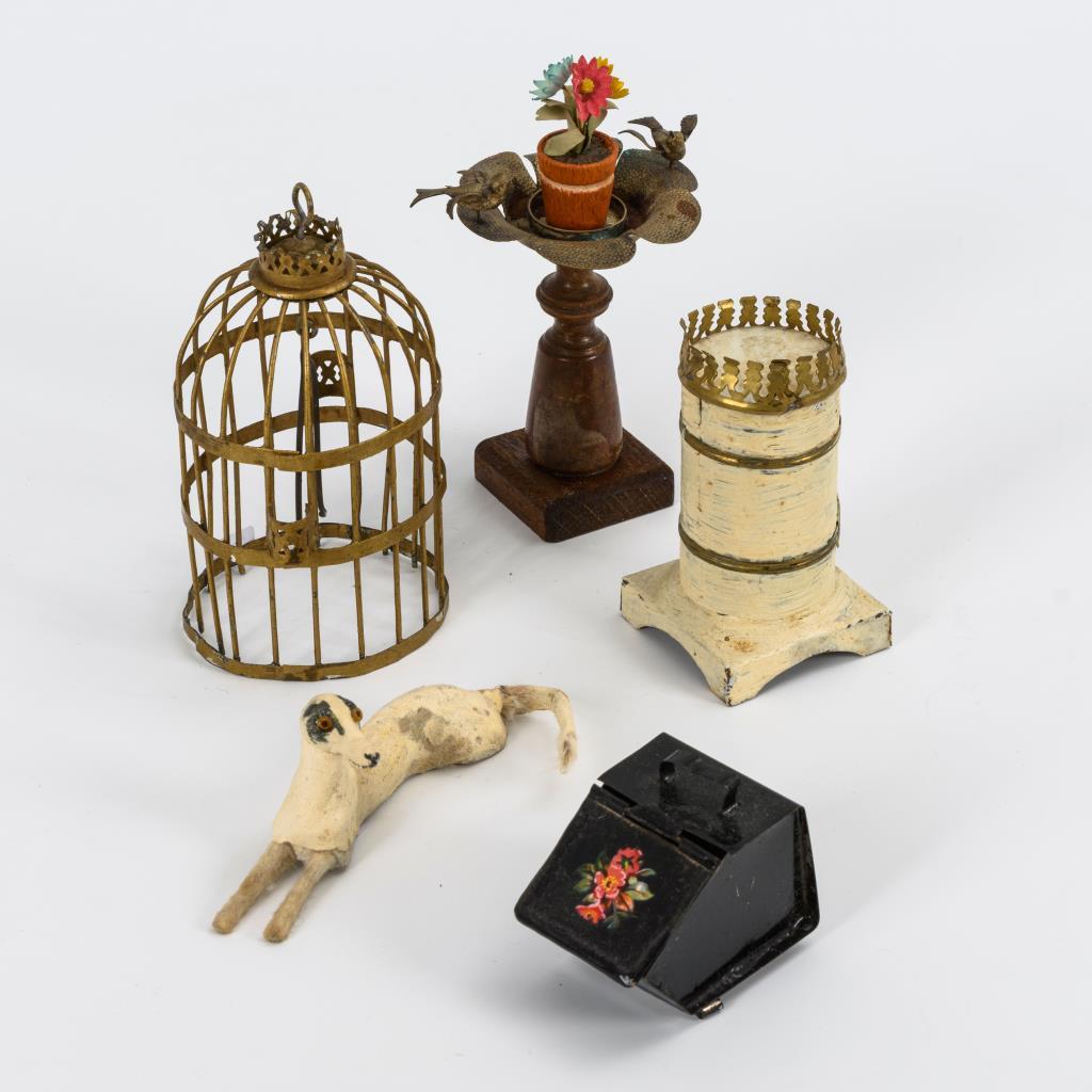5 seltene Teile: Liegender Windhund (unterseitig bezeichnet: RH), runder Blechofen, Vogelkäfig, Blumensäule mit Vogeltränke und Kohlenträger. Altersspuren, Hund mit Fellverlust, Käfig ohne Boden.