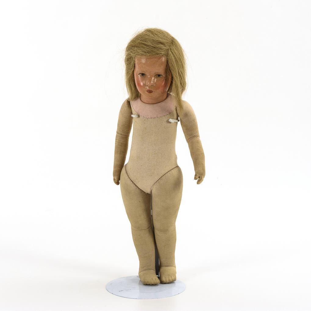 Drehbarer Kurbelkopf aus Kunststoff oder Tortulon, blonde Echthaarperücke. Körper aus grobem Nessel mit Schlenkerarmen, Beine mit Scheibengelenken. Unbekleidet. Gesicht stark retuschiert.
