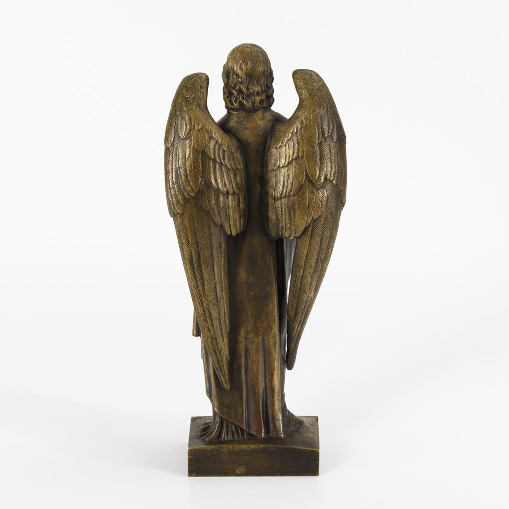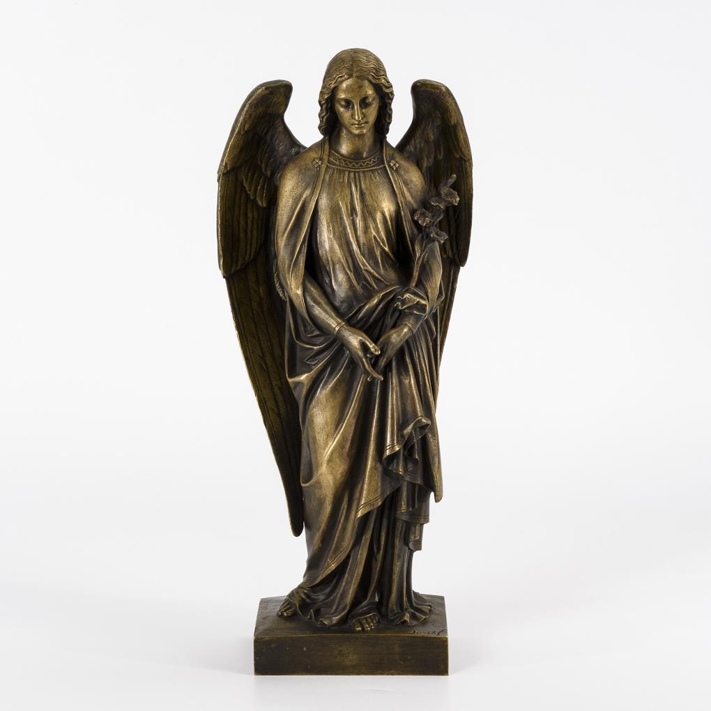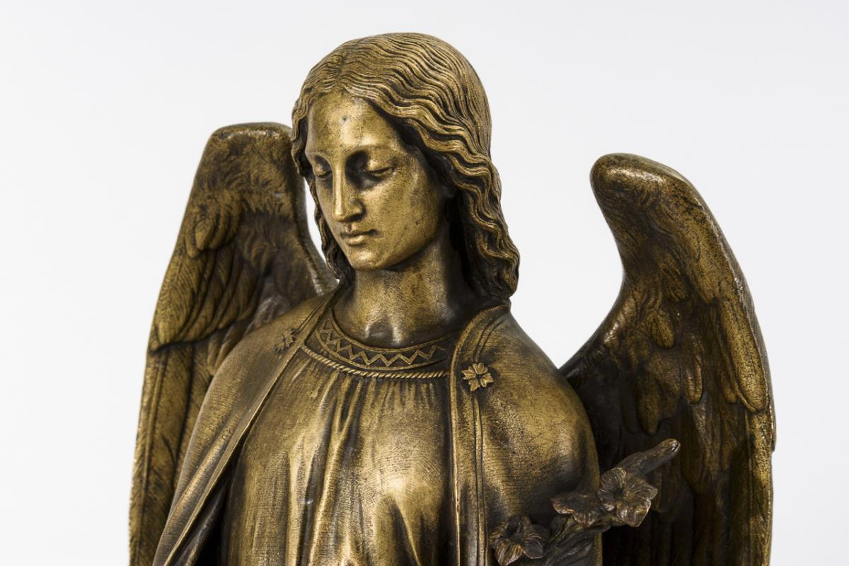In sich gekehrter Engel mit dem Symbol der Keuschheit im Arm; wohl der Erzengel Gabriel. Patina berieben.