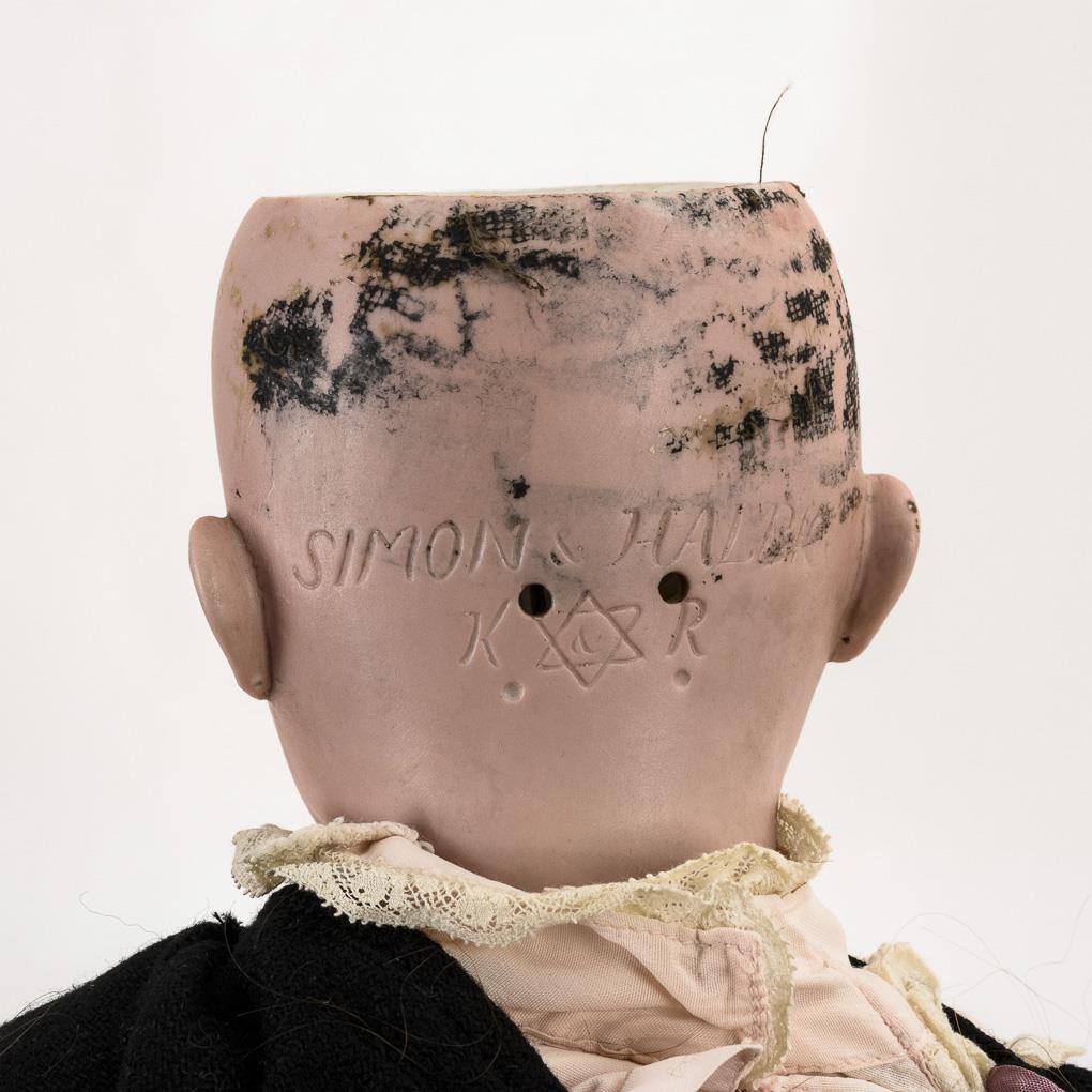 Kurbelkopf, blaue Schlafaugen, braune Echthaarperücke. 15-teiliger Gliederkörper. Hellrosa Kleid, schwarzes Cape, schwarze Schuhe. Kopf durchleuchtet: ohne Defekte, lediglich je 1 feiner Brandriss hinter den Ohren. Wimpern 1x fehlend. Körper mit kleinen (Farb-)defekten.