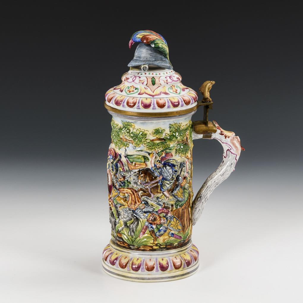 Großer Bierkrug mit umlaufendem Schlachtenrelief, Maskaronhenkel und metallmontiertem Deckel mit Helmknauf. Stand und Zunge des Henkelmaskarons restauriert.