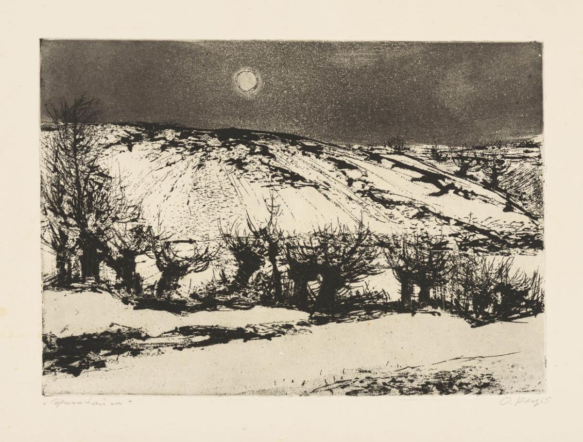 Winterlandschaft bei Vollmond. Etwas stockfleckig.