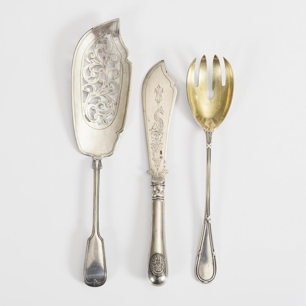 Fischmesser, Salatlöffel und versilberter Gebäckheber. Fischmesser und Löffel mit russischen Importmarken. Leichte Gebrauchsspuren.