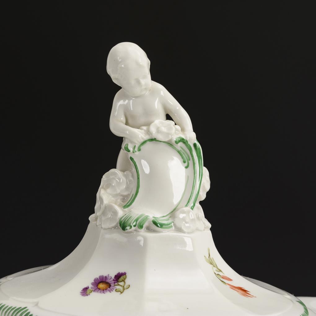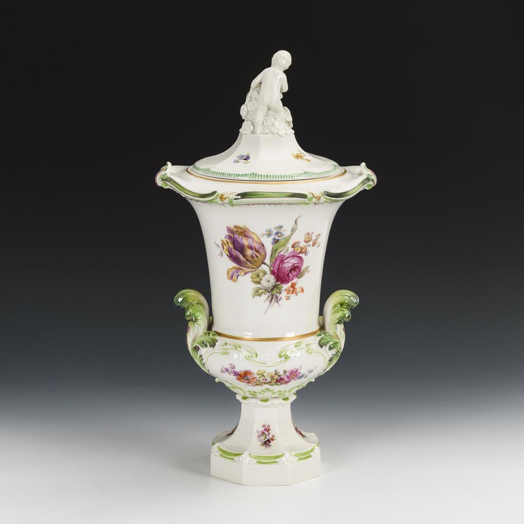 Kratervase mit Blatthandhaben, polygonalem Fuß und passend ergänztem Deckel sowie einem Putto mit Schild als Deckelknauf. Schauseitig die Darstellung einer Landschaftsinsel mit Hahn und zwei Hennen, verso ein Blumenbukett.