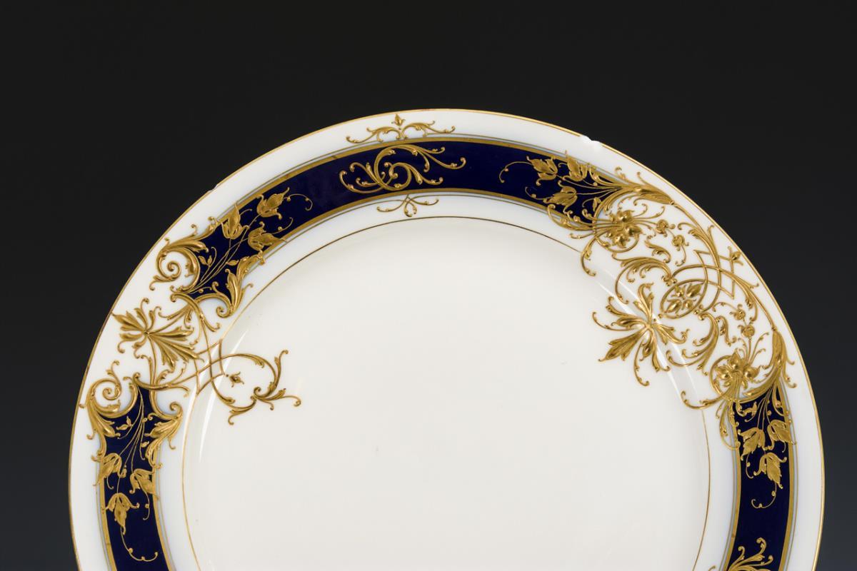 Kobaltblaues Fondband, feine, ornamentale Reliefgoldmalerei. Ø 2x 24 cm und 1x 24,5 cm.