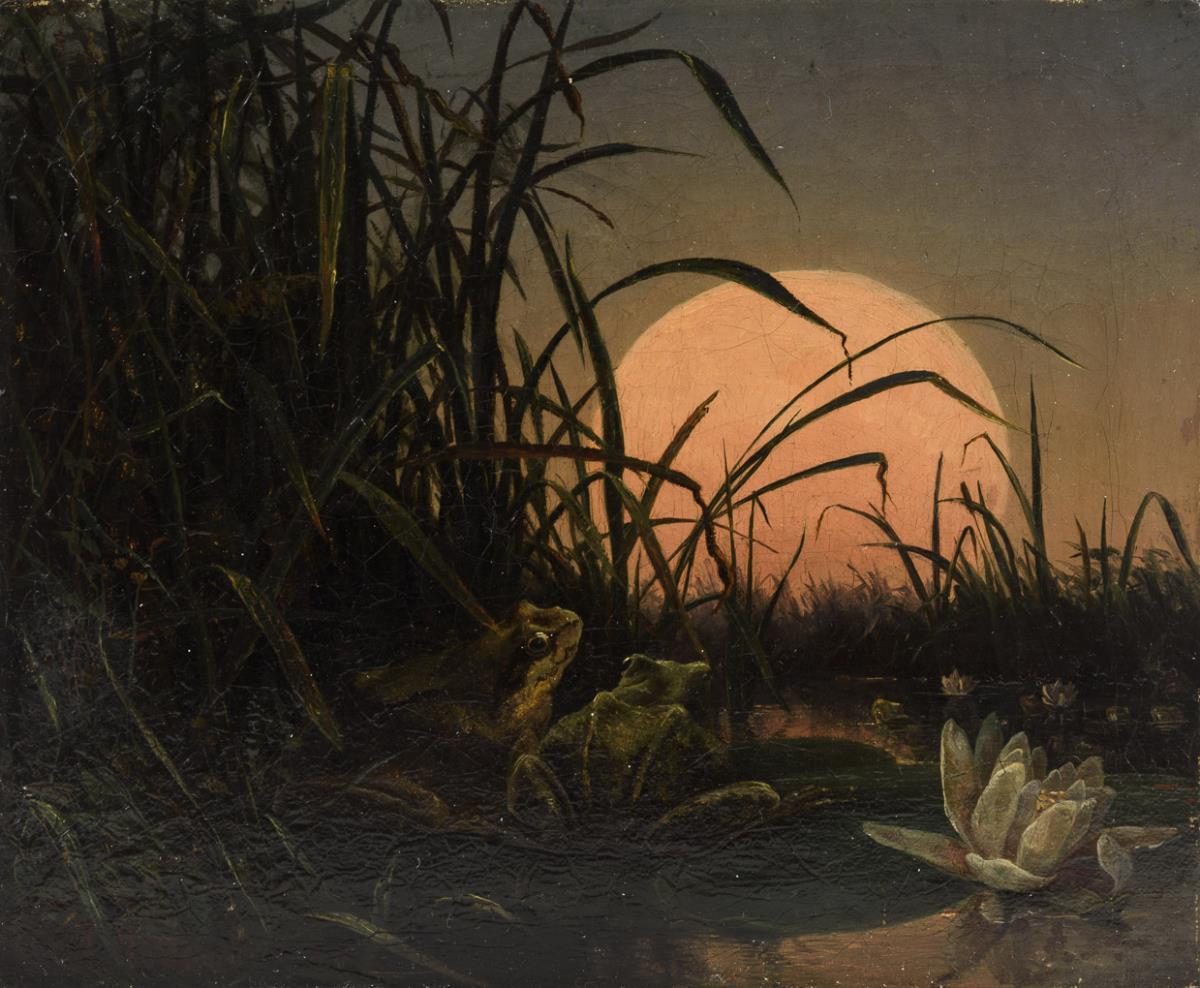 Die Tiere auf einem Seerosenblatt am Schilf mit Blick zum Sonnenuntergang. Altersspuren.