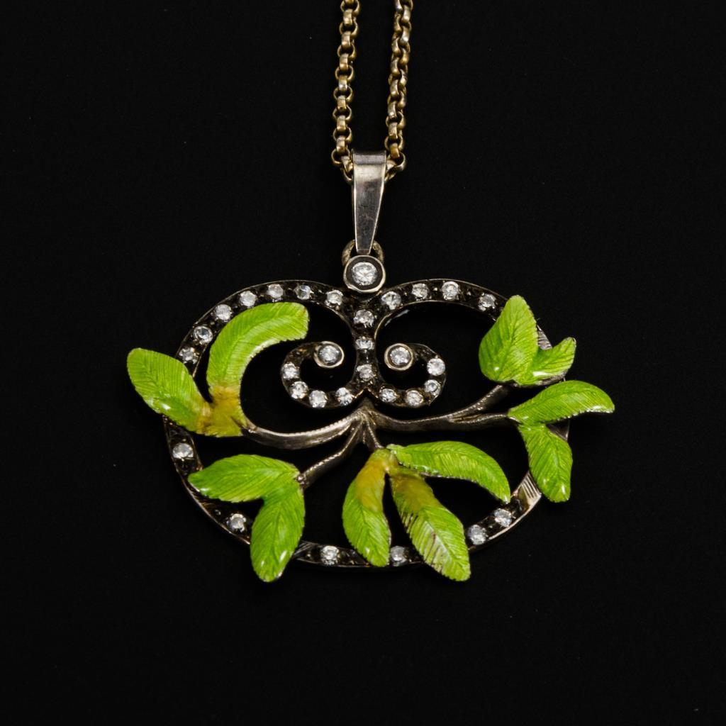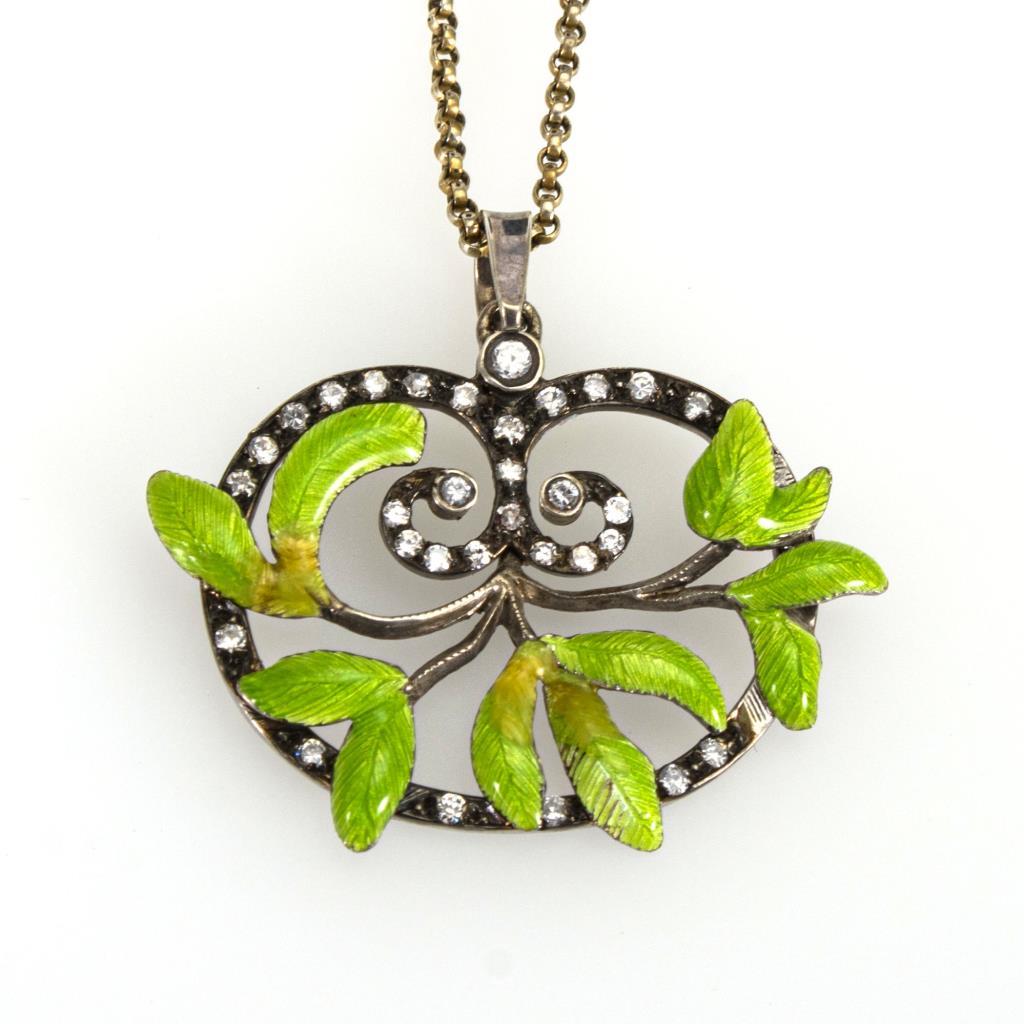 Hellgrün emailliertes Blattwerk in strassbesetztem Rahmen. Zarte Erbskette mit Ringfederschließe.