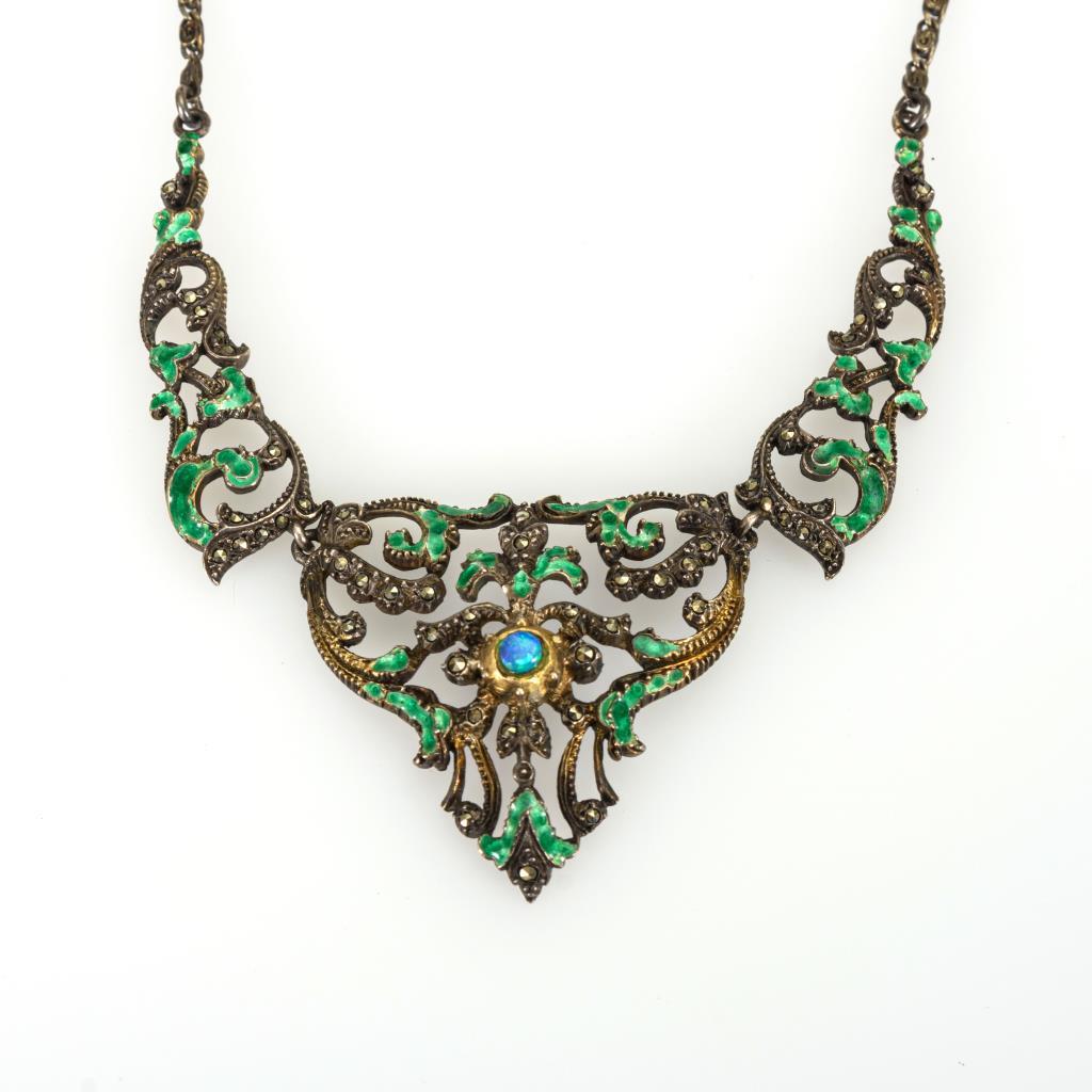 3 partiell grün emaillierte Ornamentglieder mit kleinen Markasiten. Mittig 1 Opalcabochon. S-Panzerkette mit Karabinerschließe. 1 kleiner Markasit fehlt.