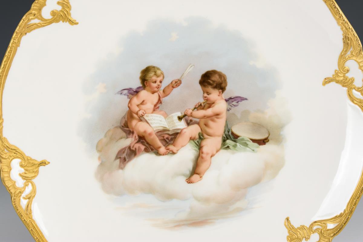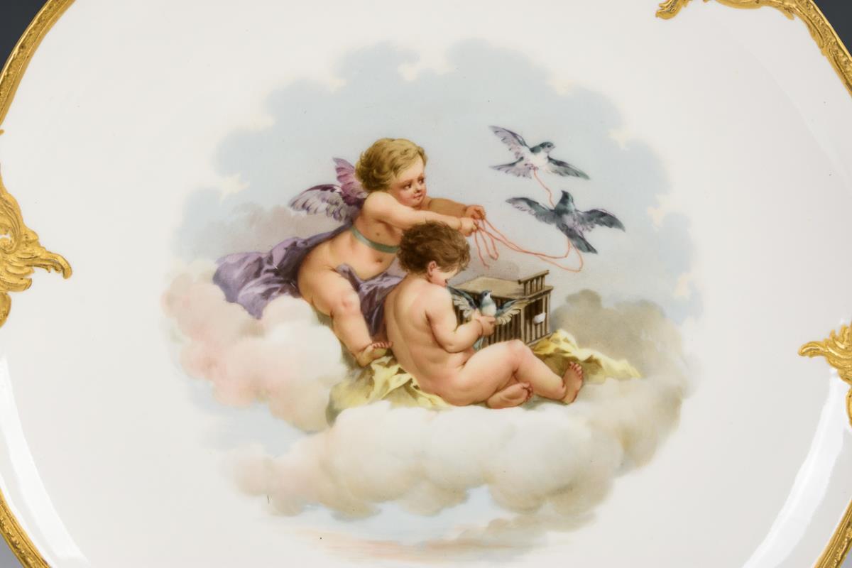 Teller mit Rocaillereliefrand. Im Spiegel die Darstellung eines auf Wolken sitzenden, musizierenden Puttenpaares bzw. eines Puttenpaares mit Tauben. Je 1 kleiner Kratzer auf der Darstellung, 1x mit Randchip und Goldretusche am Rand.
