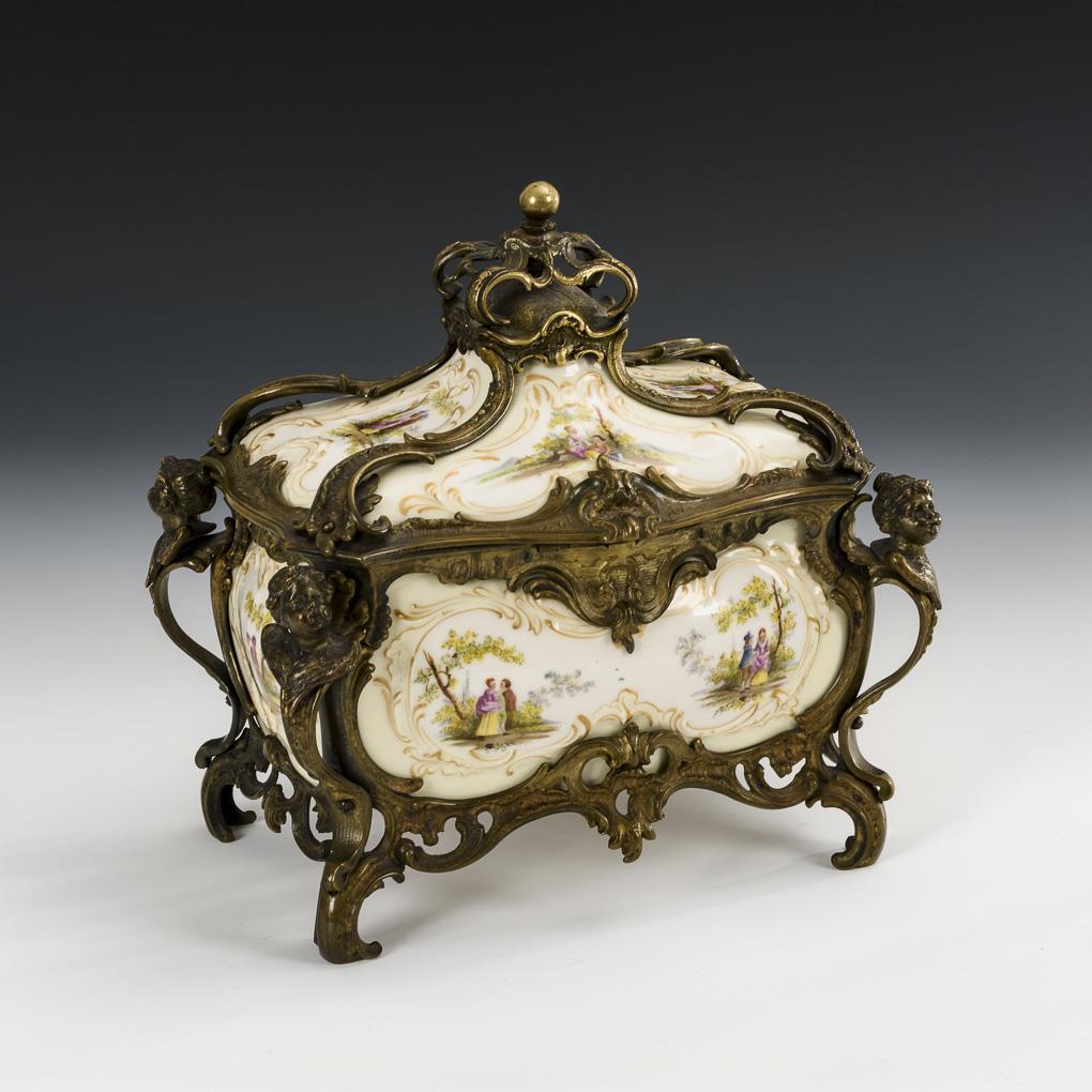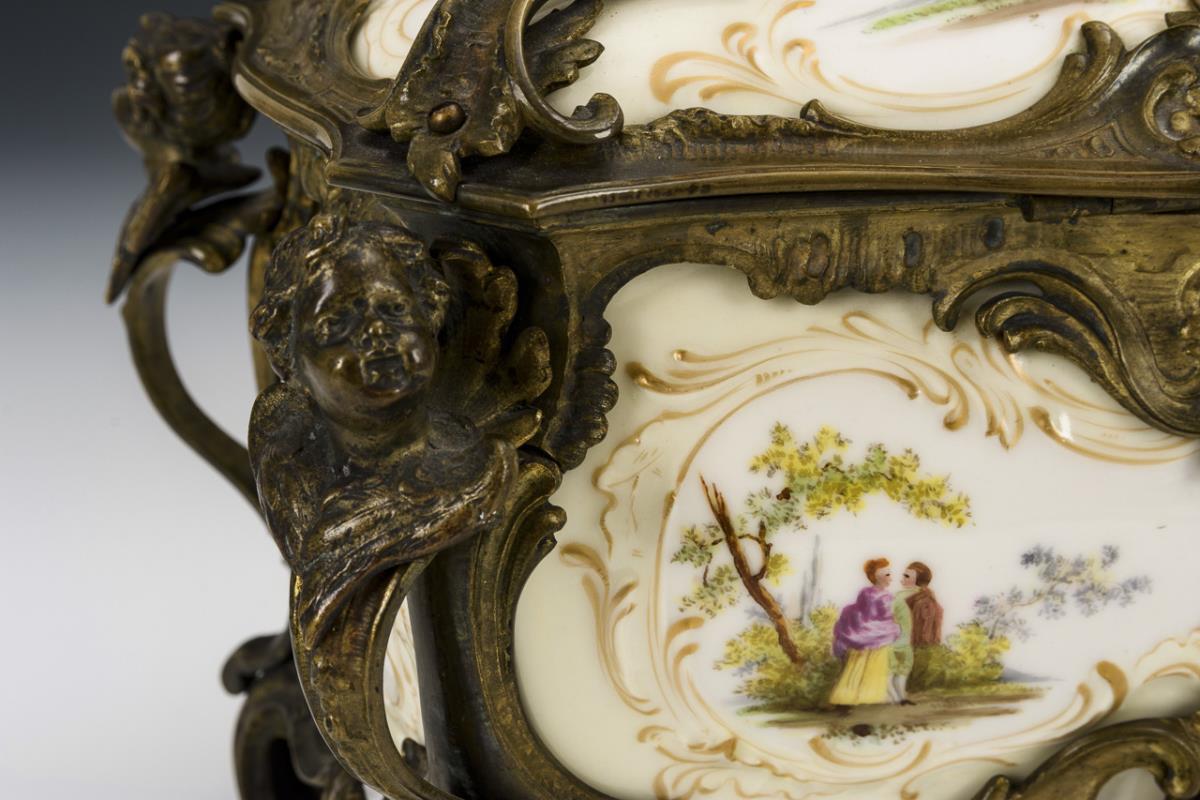 Porzellandose und -deckel mit Rocaillerelief und kleinen Watteauszenen, eingefasst von einer schwungvoll gearbeiteten Bronzemontierung mit teils durchbrochenen Rocaillen, Kronenknauf und vier Engelsköpfen. 1 Engelskopf locker, Bronzemontierung partiell leicht restauriert.