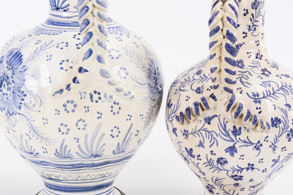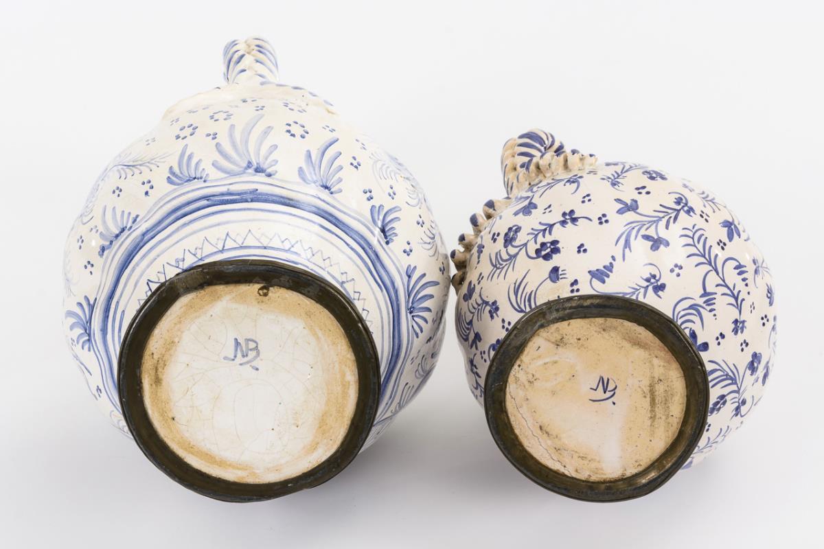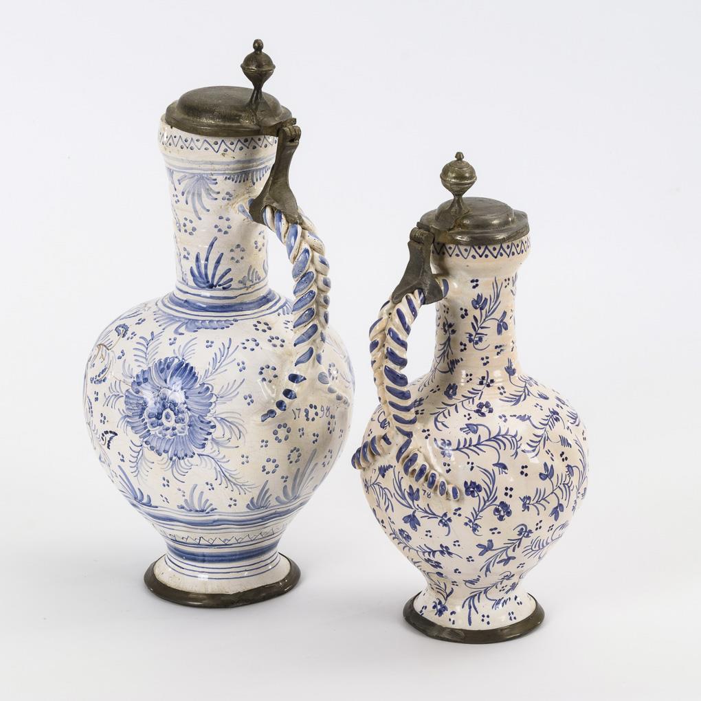 Kugelbauchkrüge mit godronierter Wandung, gerilltem Hals, Zopfhenkel und Rundfuß. 1x Fruchtkorb (H 37,5 cm), 1x Vögelesdekor (H 32 cm). Beide mit Zinndeckel und Kugeldrücker, Zinnstandring. Mit Defekten.