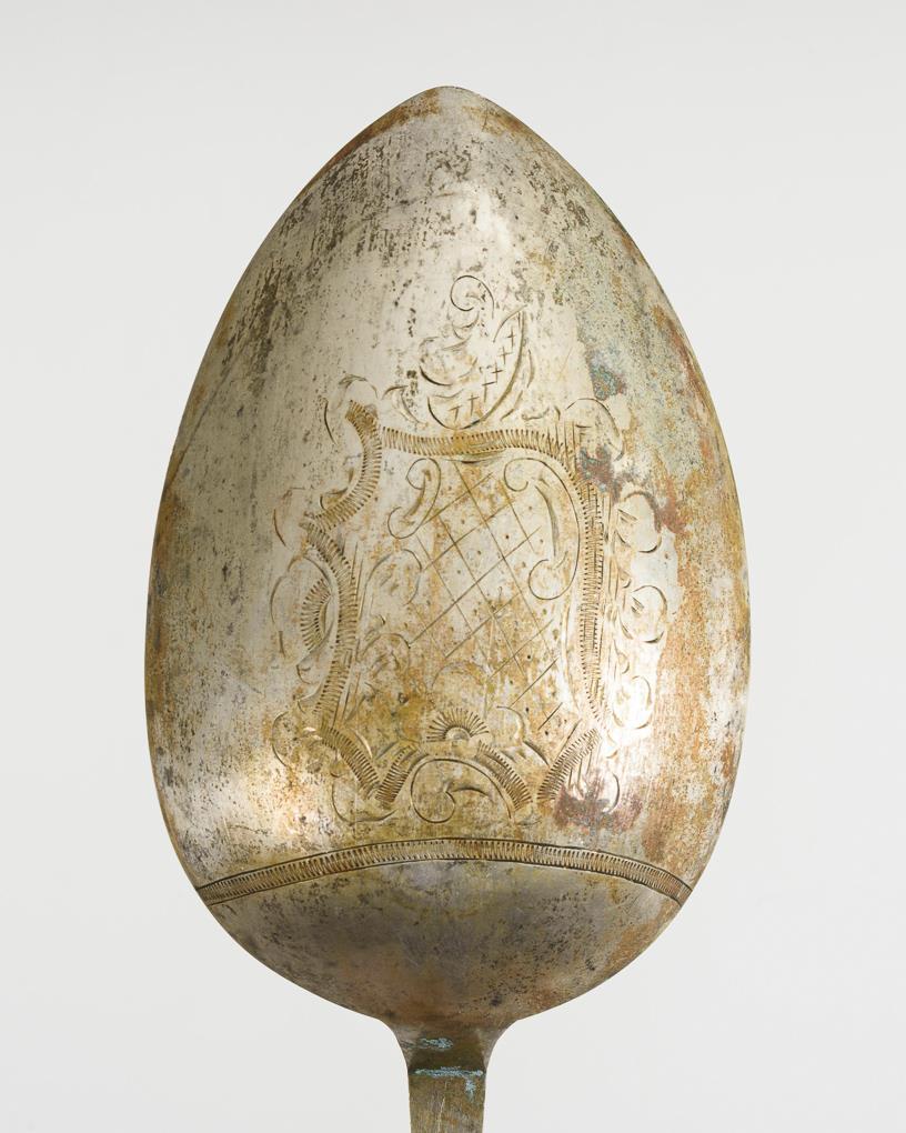 Sehr großer Servierlöffel mit Rocaillengravuren. Altersspuren.