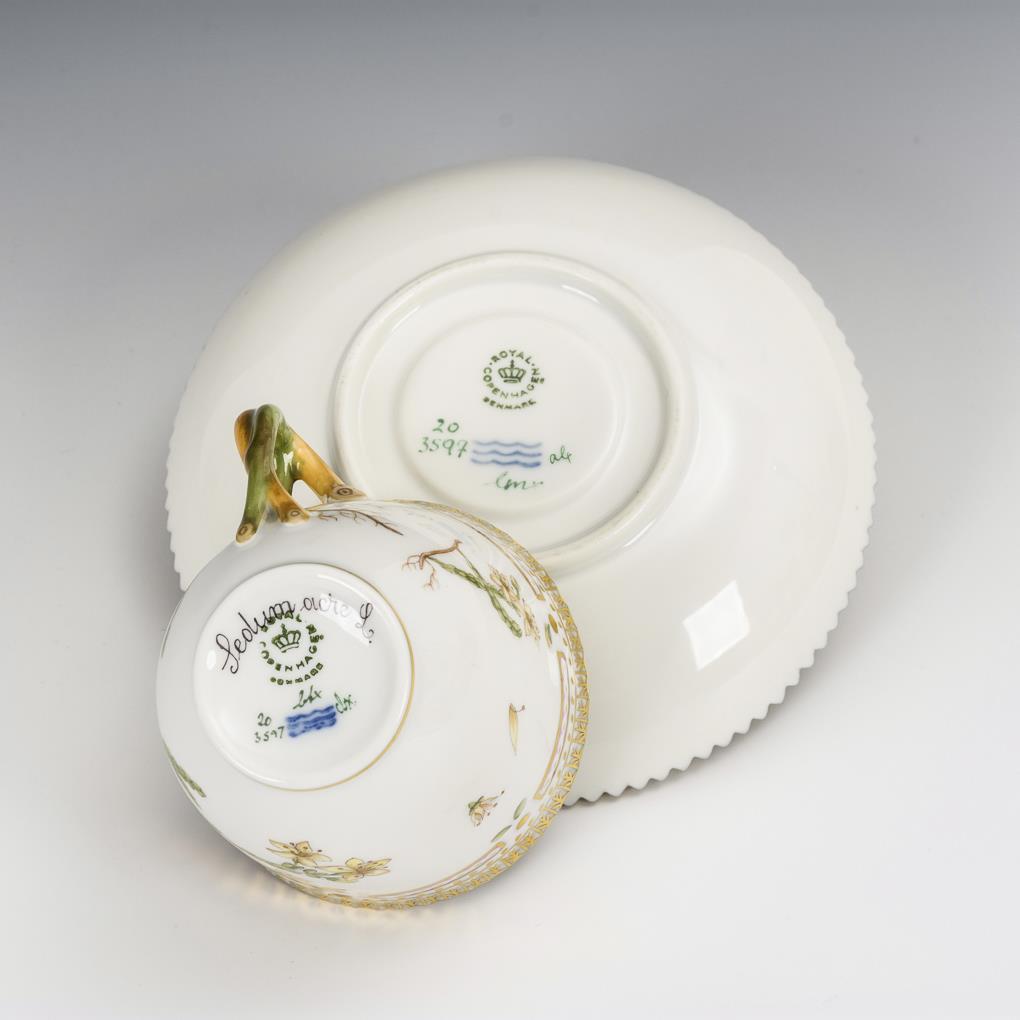 Polychrome Malerei, Goldstaffage. H Tasse 6,5 cm, Ø originale Untertasse 13,5 cm.