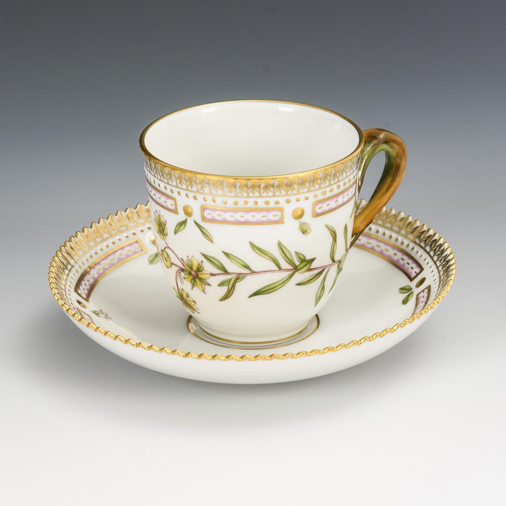 Polychrome Malerei, Goldstaffage. H Tasse 6,5 cm, Ø originale Untertasse 13,5 cm.