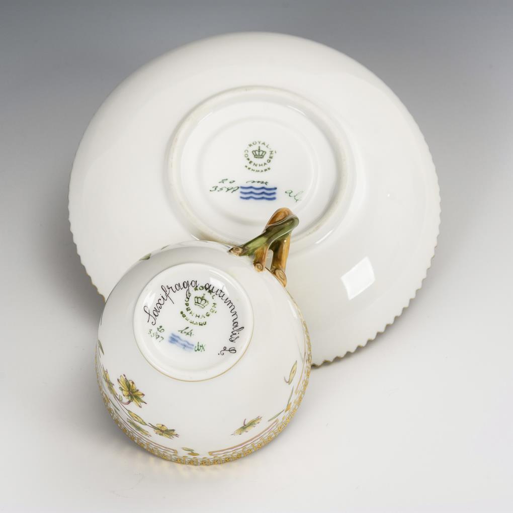 Tasse mit Asthenkel und Untertasse mit Zackenrand. Auf der Tasse die Darstellung einer Steinbrechpflanze, unterseitig lateinisch bezeichnet.