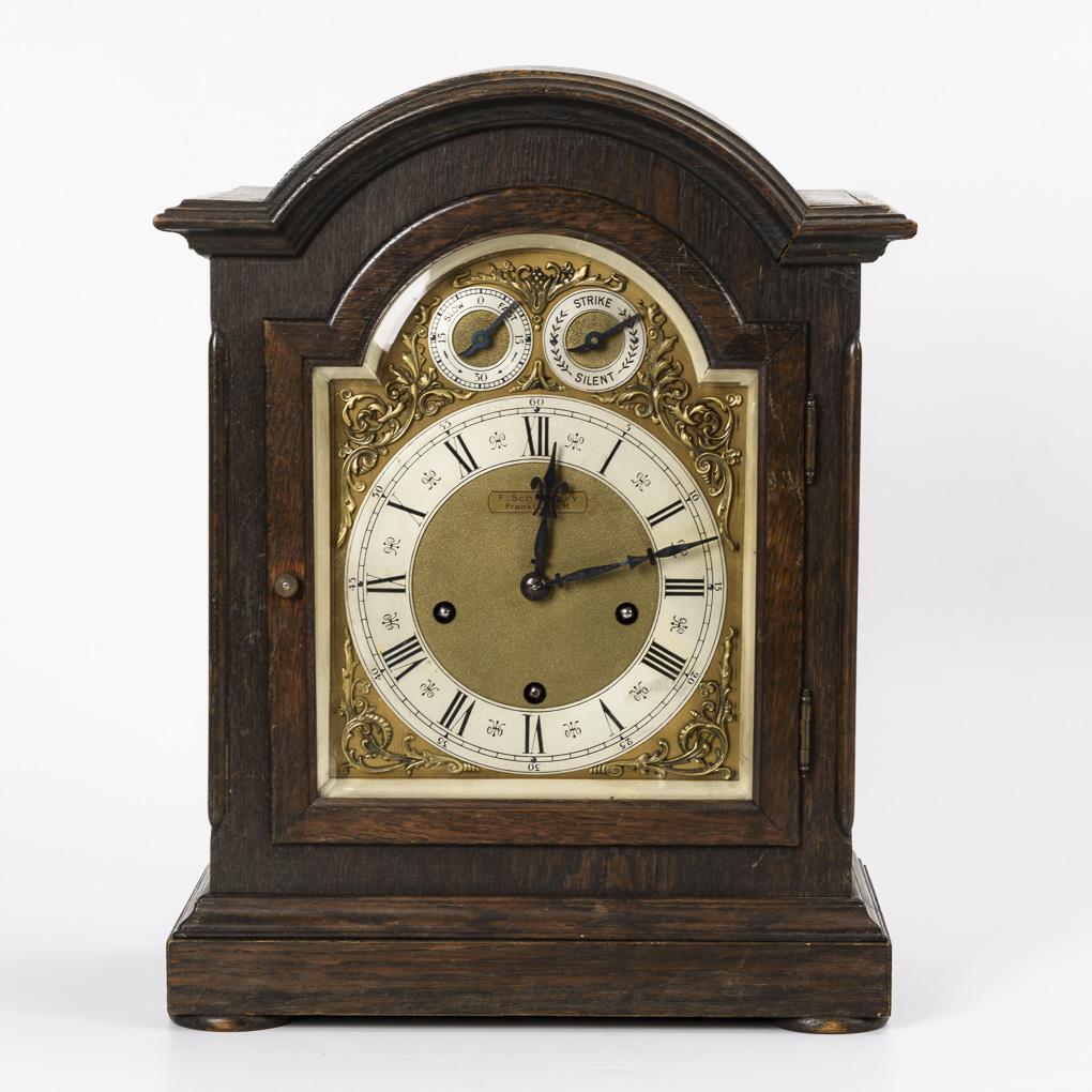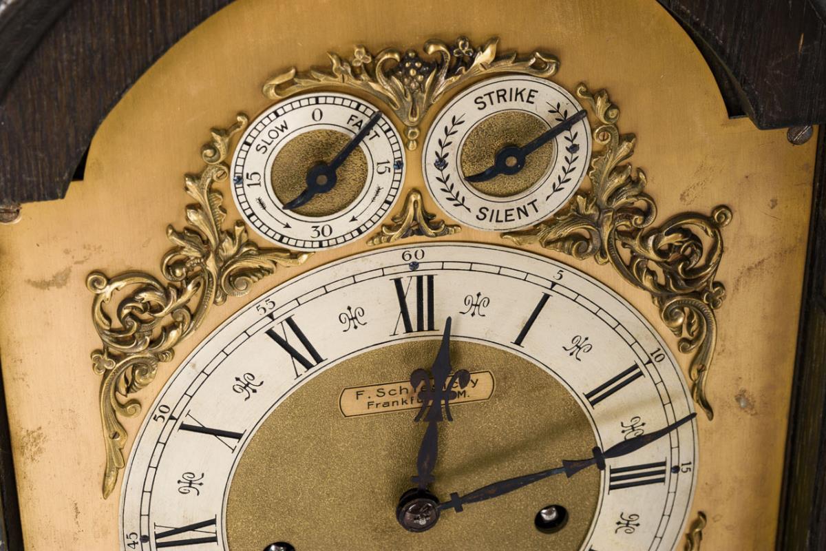 Werk mit Viertelstundenschlag auf 6 Tonstäben. Reinigungsbedürftig, läuft. Messingzifferblatt, teils versilbert, arabische und römische Zahlen, Minutenkranz, Romaines-Zeiger, Hilfsblätter für Regulierung und Schlag. Herstellerprägung Anzeige: "F. Schlesicky, Frankfurt a.M.".