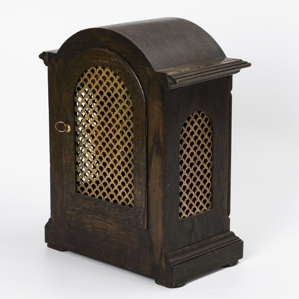 Architektonisches Barockstil-Gehäuse mit Rundbogensegmenten, 3-seitig geöffnet mit Schuppengitter. Leichte Alters- und Gebrauchsspuren.