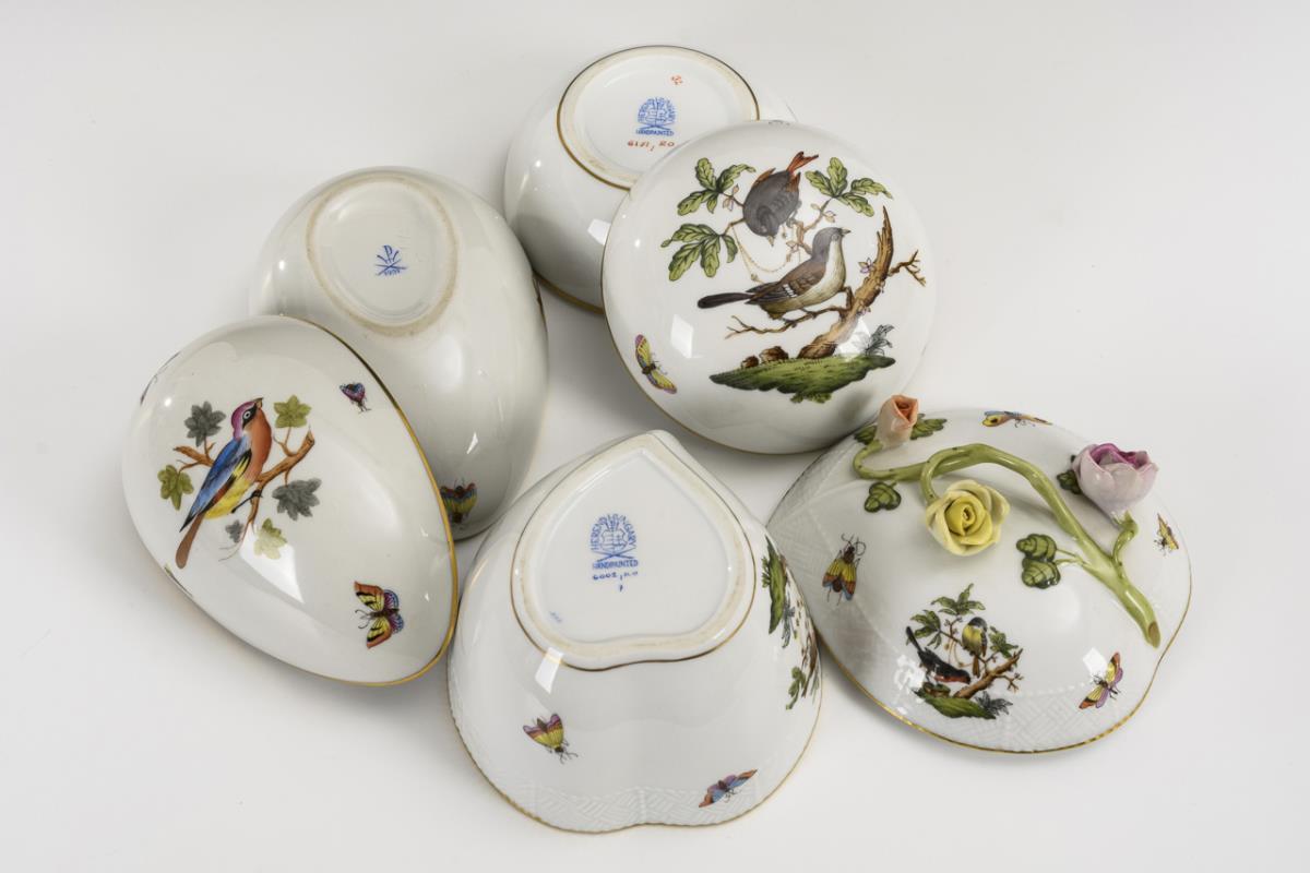 Herzdose mit Rosenblütenhandhabe (H 11,5 cm), runde Dose (H 9 cm) und Eidose (L 14,5 cm).