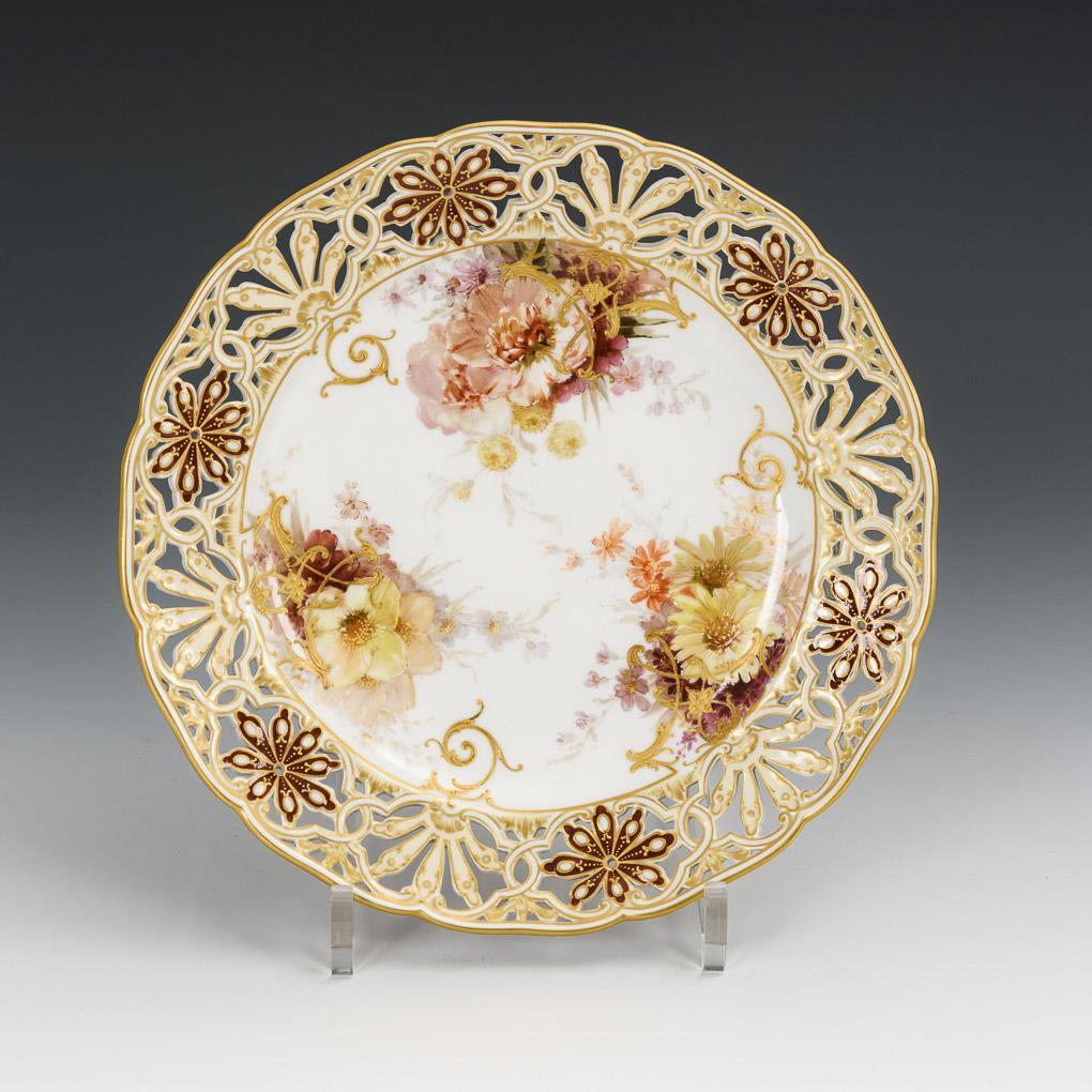 Modell "Neugerippt, Durchbruch neue Sorte". Teller mit Palmetten- und Sterndurchbruch auf der Fahne. Im Spiegel drei reliefgoldverzierte Blumenbuketts in Weichmalerei mit Pfingstrosen, Anemonen und Astern, auf der Fahne Fonds in Braun, Creme und Hellgelb.