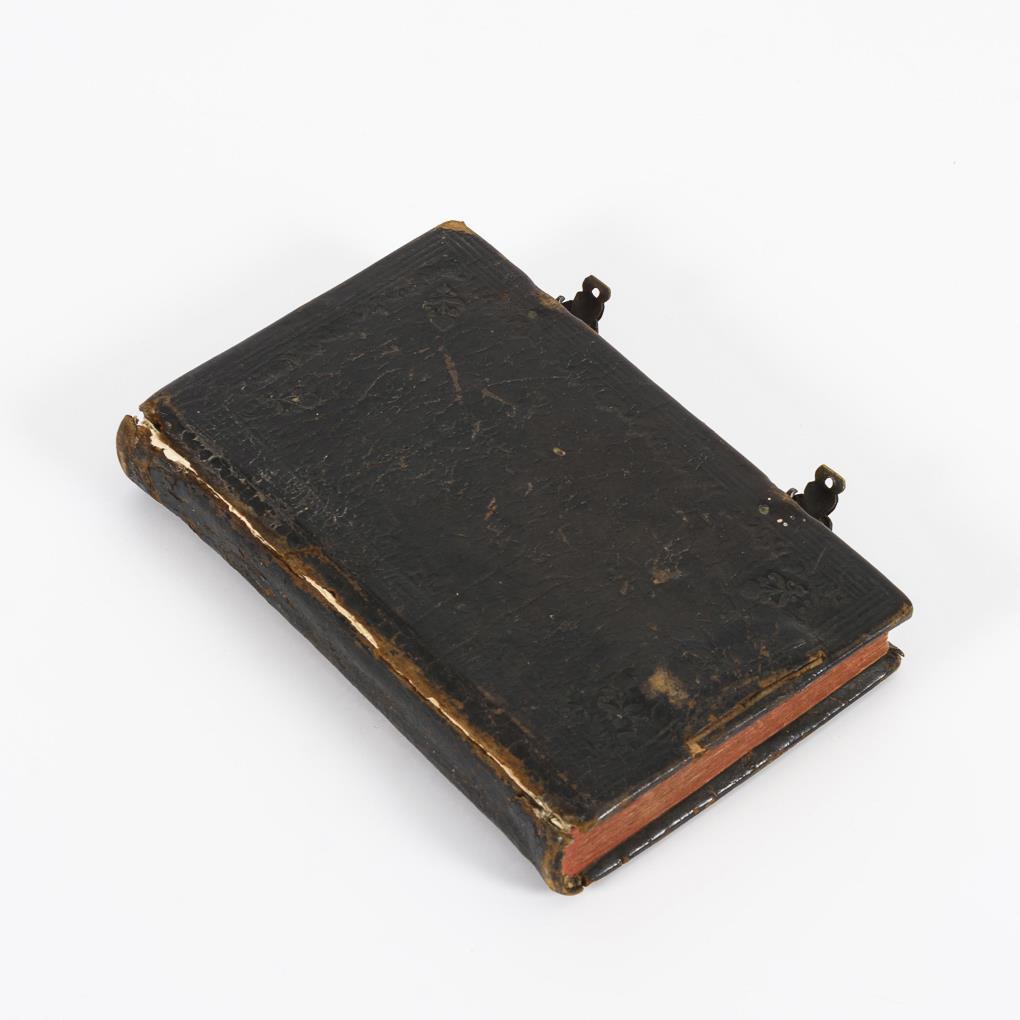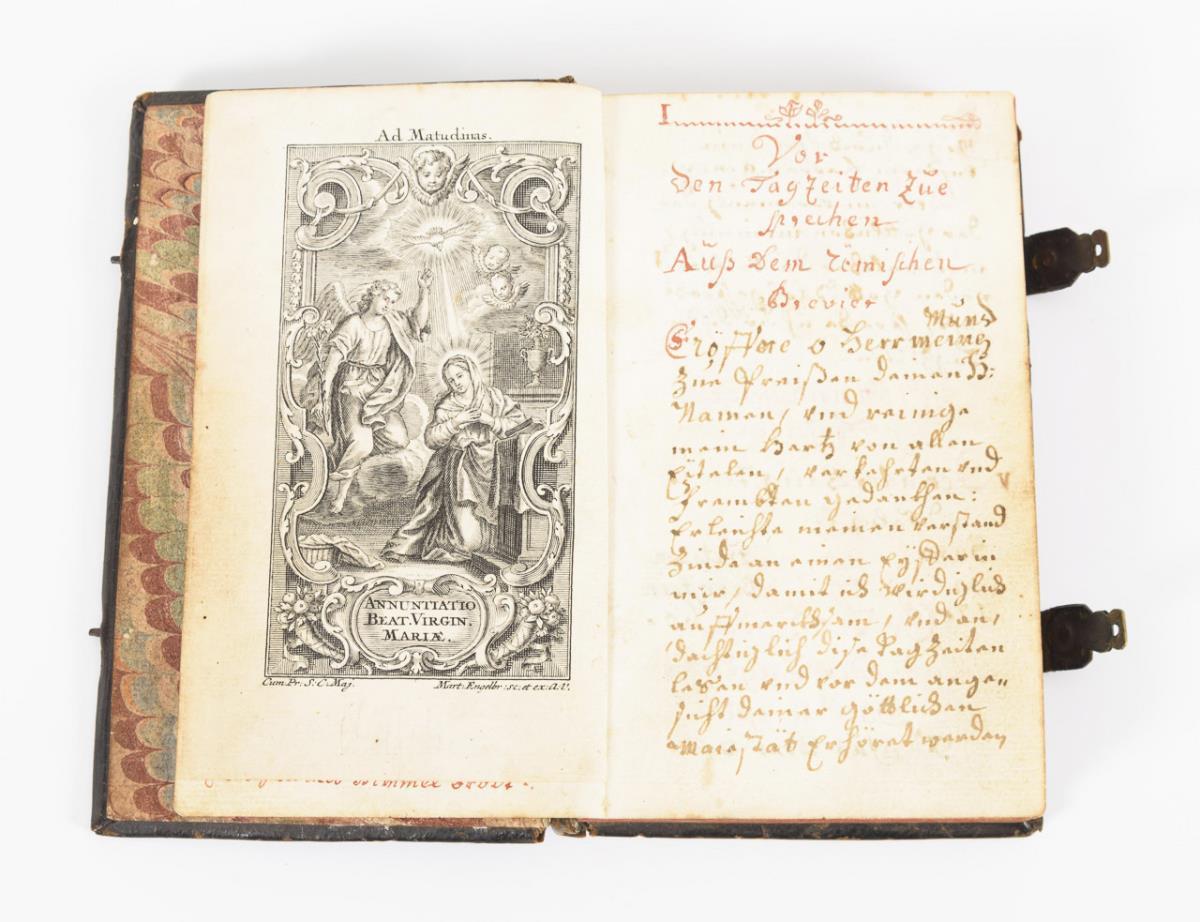 Psalme, Gebete und Andachtstexte in schwarzer und roter Tinte geschrieben. Illustriert durch zahlreiche Kupferstiche. 260 und 16 Seiten im Ledereinband, Rotschnitt, Schließen. Vorderer Buchdeckel lose.