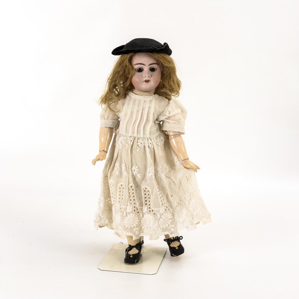 Kurbelkopf, braune Schlafaugen, Ohrlöcher, blonde Echthaarperücke. 15-teiliger Gliederkörper. Weißes Kleid, alte Unterwäsche, schwarze Schuhe, schwarzer Samthut. Kopf durchleuchtet: ohne Defekte, minimaler Perückenpull.