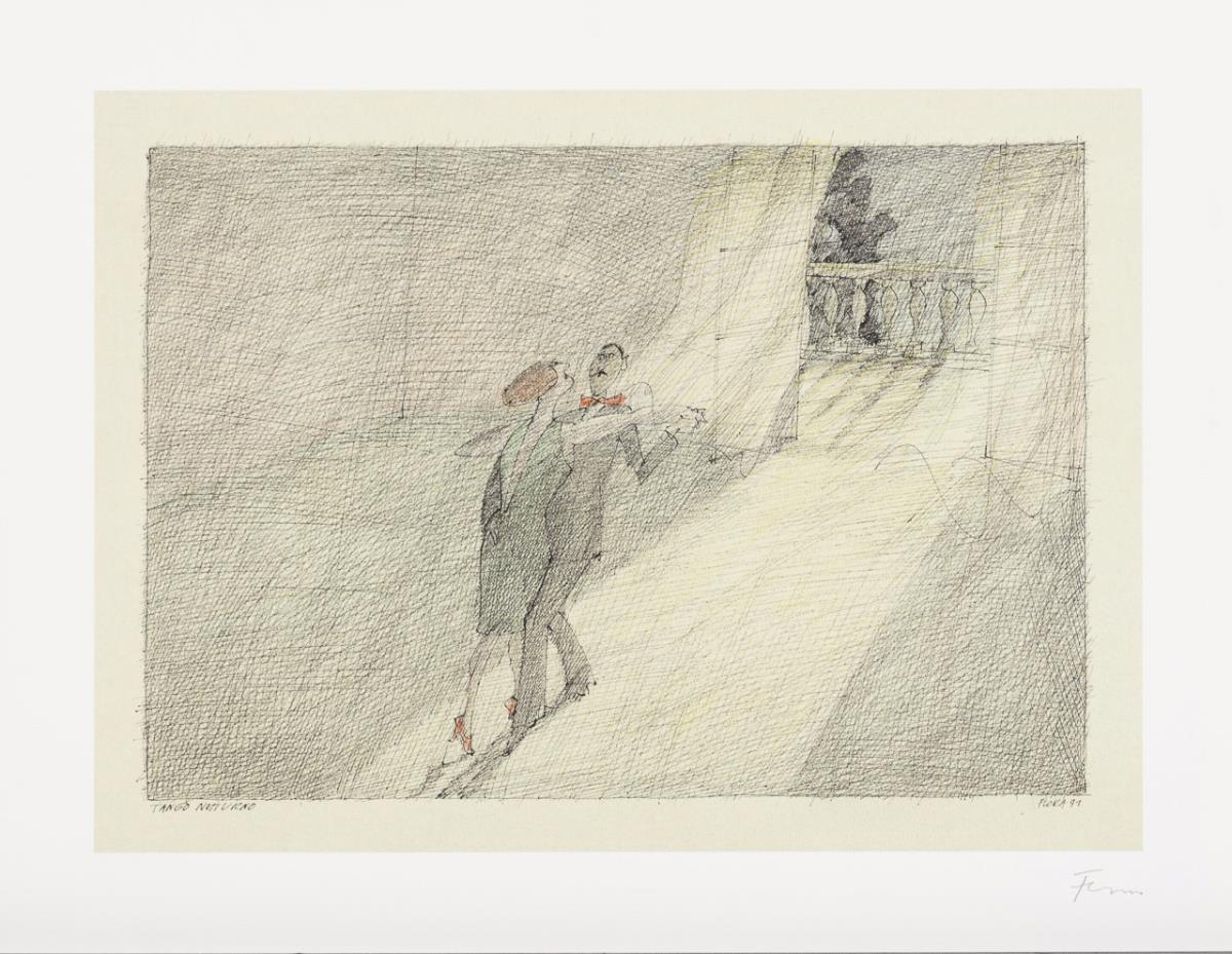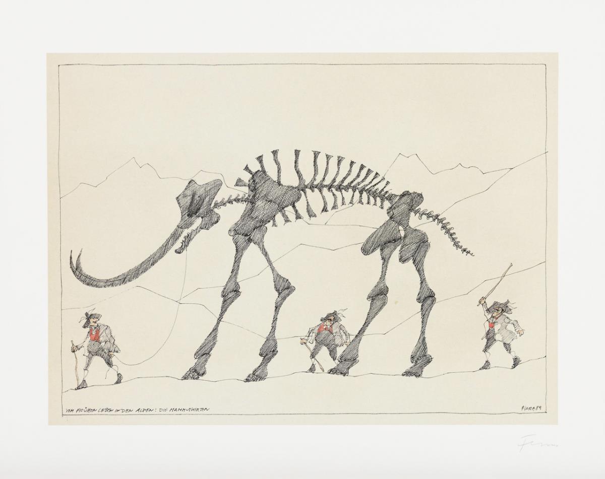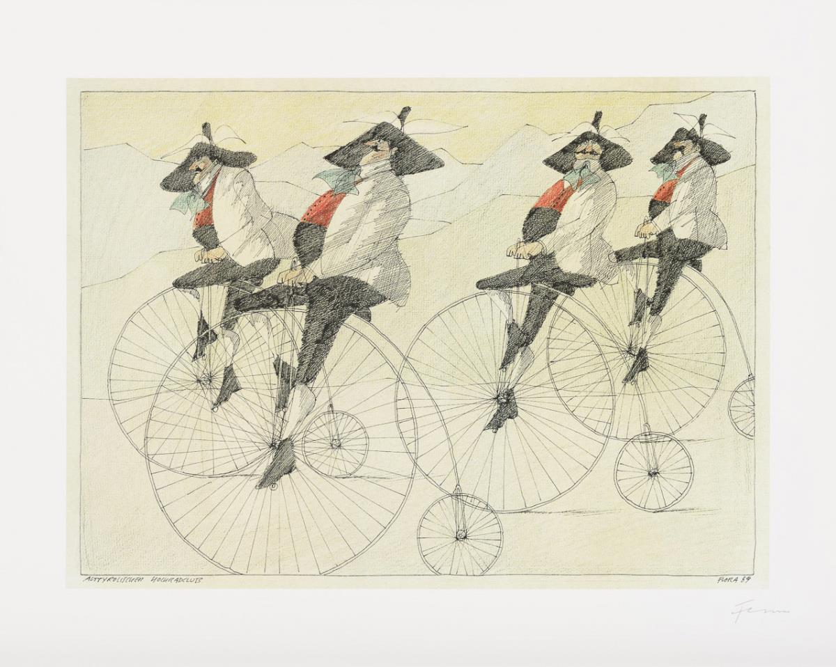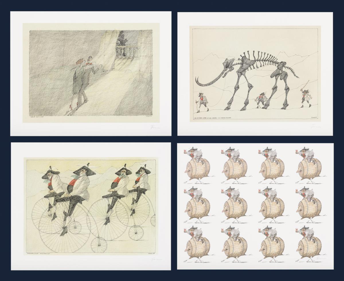 "Tango Notturno", Blatt: 34 x 44 cm, [1991] | "Vom frühen Leben in den Alpen: Die Mammuthirten", Blatt: 40 x 50 cm, [1989] | "Alttyrolischer Hochradclub", Blatt: 40 x 50 cm, [1989] | Ohne Titel, Blatt: 40 x 50 cm.