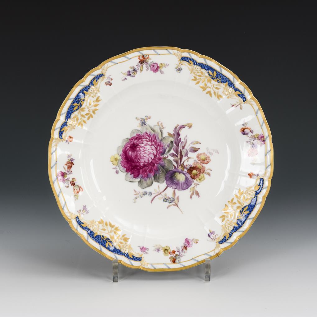 Modell "Breslauer Stadtschloss". Speiseteller mit einem Blumenbukett mit Mohn, Prunkwinde und Aurikel im Spiegel.
