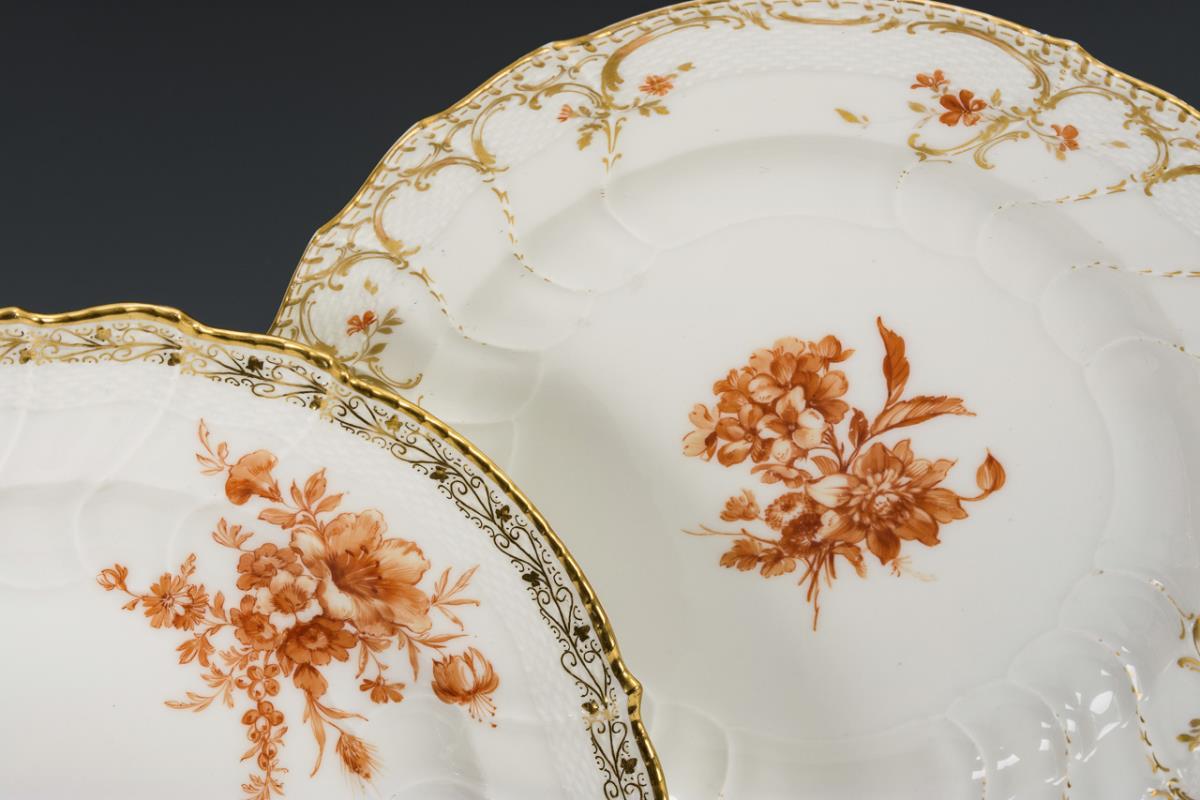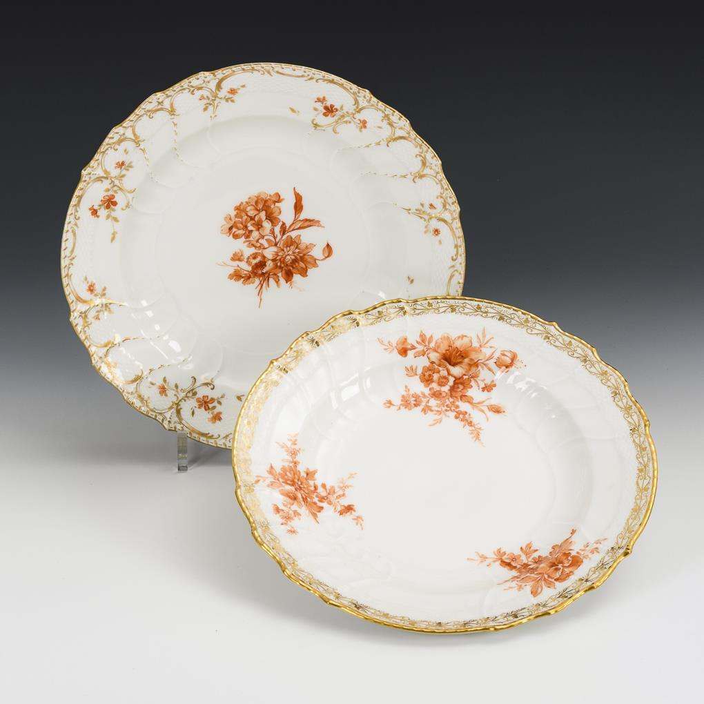 Modell "Neuozier". Speiseteller mit verschiedenen Goldbordüren und korallenroten Blumenbuketts. 1x minimaler Goldabrieb, 1 kleine Randbestoßung und Kratzspuren im Spiegel.