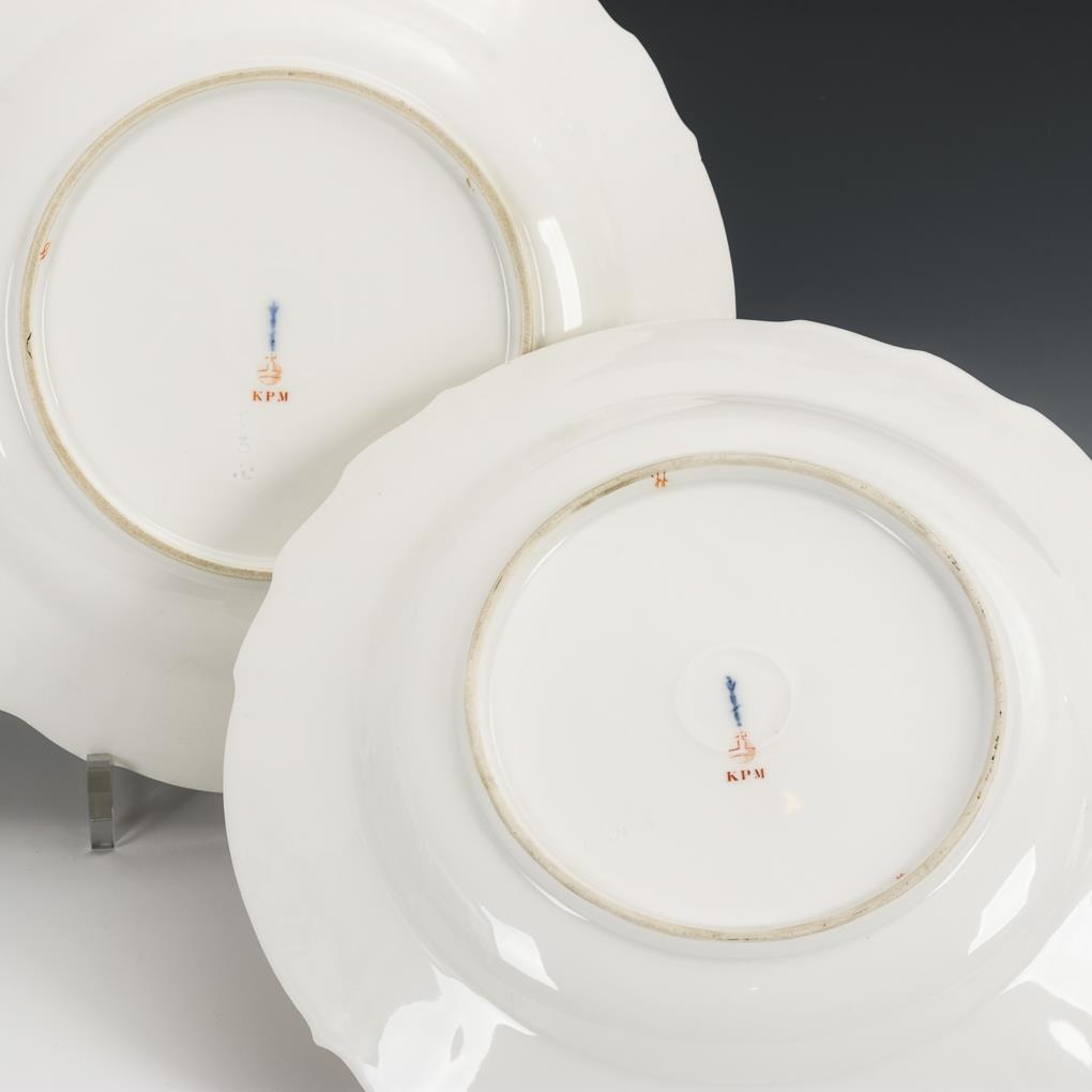 2 Teller mit korallenroter Blumenmalerei. KPM Berlin.