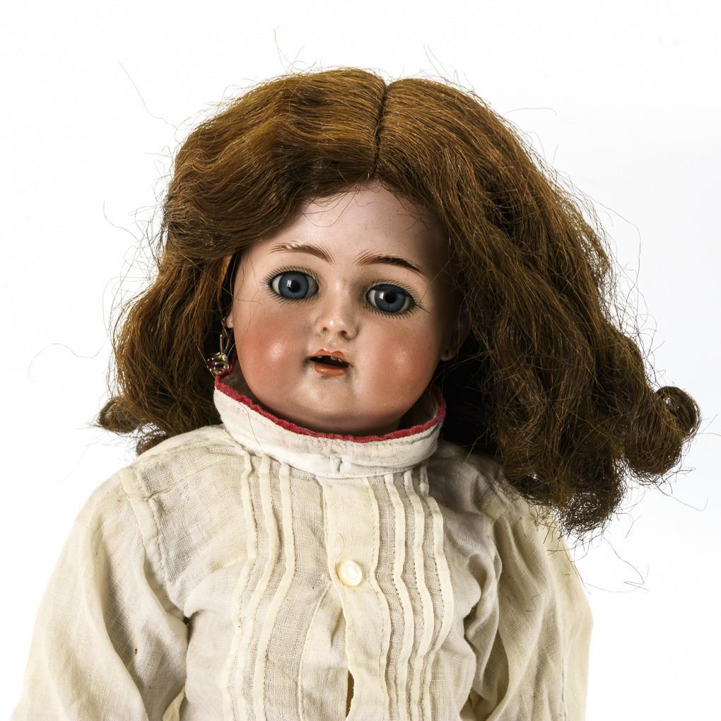 Kurbelkopf, blaue Schlafaugen, 1 Ohrring, braune Kunsthaarperücke. 15-teiliger Gliederkörper. Weiß bekleidet, braune Strümpfe. Kopf durchleuchtet: ohne Defekte, lediglich 2 Chips an den Ohrlöchern, 1 Zahn fehlt. Körper teils übermalt, mit kleinen Defekten, 1 Finger fehlt.