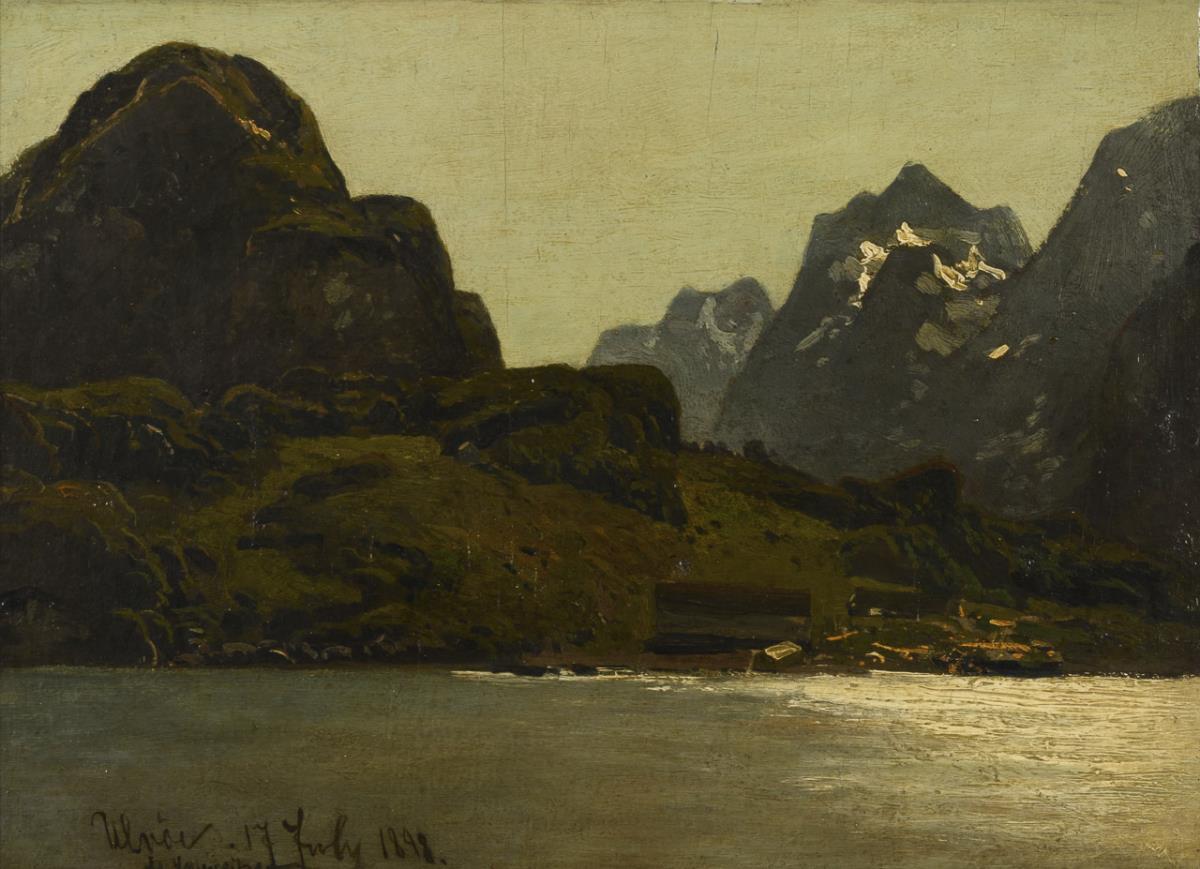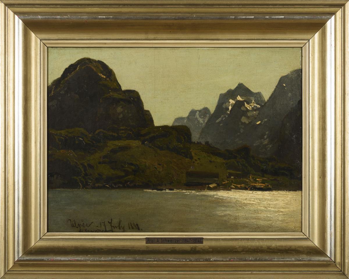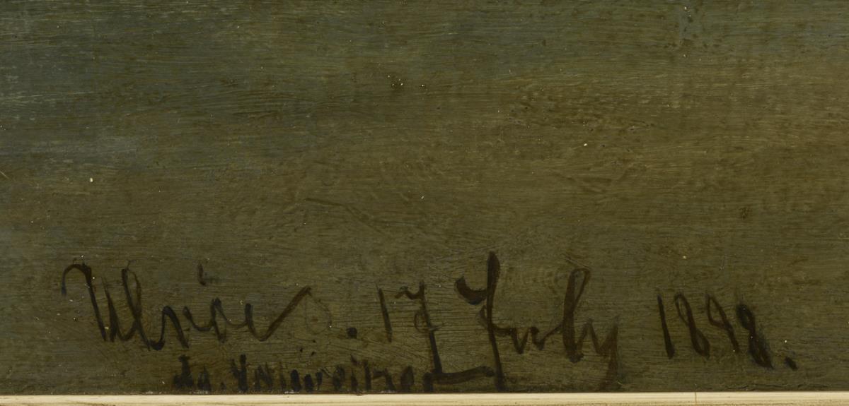 Öl/Holz. Links unten signiert mit undeutlichem Zusatz, verso bezeichnet neben Sammlungsstempel "W. u. T. Scheen Düsseldorf". Datiert: 17 July 1898.